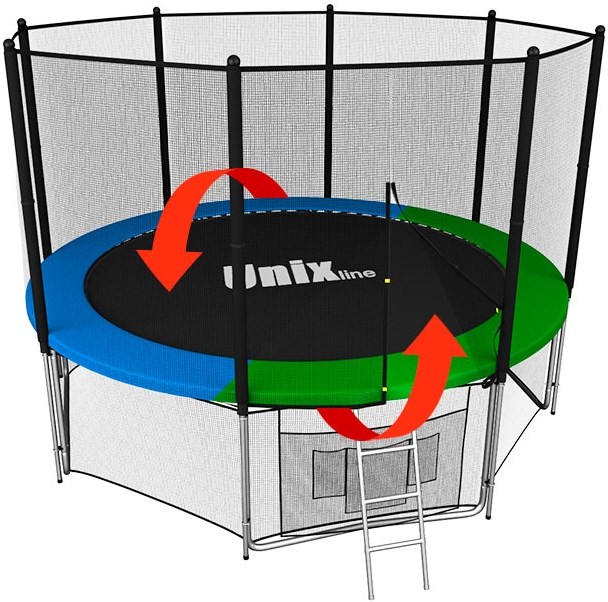Помимо верхней защитной сетки, все батуты модельного ряда UNIX Line Classic оборудованы нижней защитной сеткой, которая препятствует проникновению под прыжковое полотно батута детей, животных, а так же попаданию посторонних предметов, и лестницей с двумя ступенями для удобства пользования. А в моделях диаметром от 10FT (305см.), в комплект входят специальные крепления батута к земле (колышки).