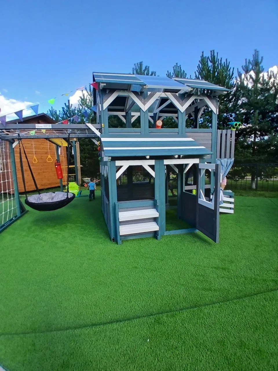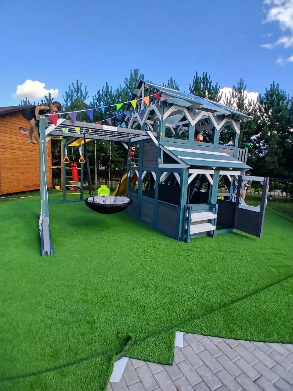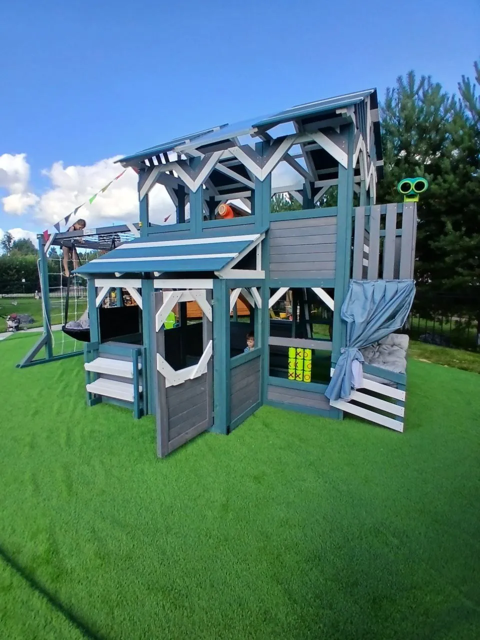 Этот комплекс сочетает в себе игровую и спортивную площадку, а также уютный детский домик с просторным игровым пространством. Он открывает двери в мир сказочных приключений для детей разного возраста (от 3 до 16 лет), развивая их физические способности и воображение.