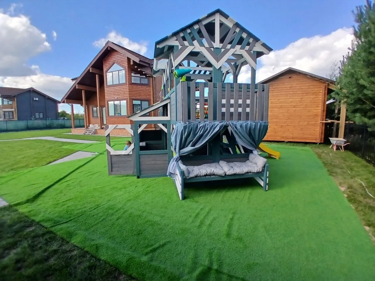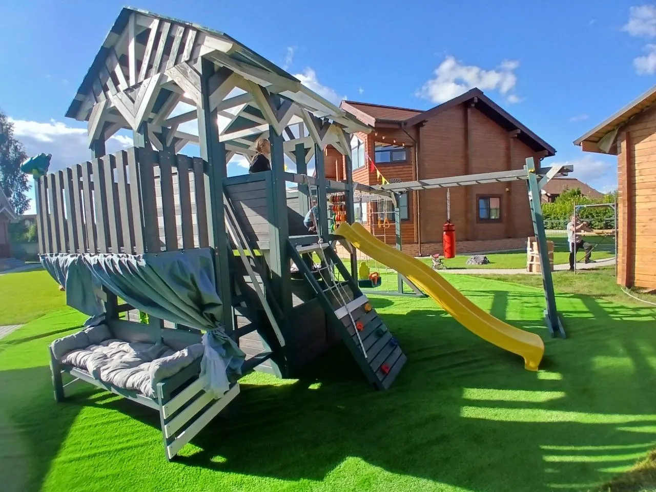 Игровые зоны комплекса способствуют развитию и обучению, включая подготовку к школе. Родители могут продуктивно проводить время с детьми, чередуя обучающие и спортивные игры на свежем воздухе.