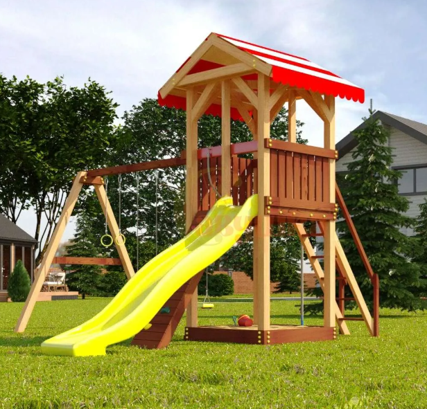 Эта экологичная модель имеет универсальную конструкцию. Ее основа – игровая башня, забраться на которую дети могут по пологой лестнице с деревянными ступенями или скалодрому с канатом. Под башней оборудована песочница для спокойных игр, а рядом – две пары качелей. Это лучший вариант, если в семье двое детей – тогда споров из-за качелей не возникнет.