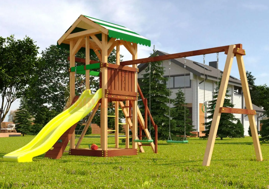 Надежность конструкций и высокое качество материалов позволяют без опаски использовать комплексы на площадках, где играют одновременно несколько детей. Каркас комплекса изготовлен из клееного бруса. Дерево отвечает строгим требованиям ГОСТ и отличается долговечностью. Материал стабилен: он не меняет своих первоначальных размеров. От влаги древесина защищена сертифицированным водостойким покрытием на натуральной основе.