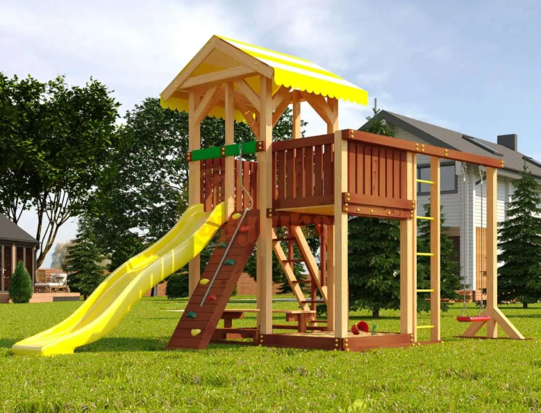 Эта модель - всепогодный двухуровневый игровой комплекс со спортивным модулем. На нижнем ярусе расположены песочница, столик, две лавочки. Верхний уровень включает башню и балкон, попасть в которые можно по лестнице или высокому скалодрому с длинным канатом. Игры с канатом развивают координацию и укрепляют мышцы рук. Платформа поднята на расстоянии 1,5 м от земли, поэтому под ней ребенок может стоять в полный рост. Пластиковая горка длиной 3м зимой может быть заменена на широкий деревянный скат для ледянок. Зимние развлечения в игровом комплексе более безопасны, чем в необорудованных местах.