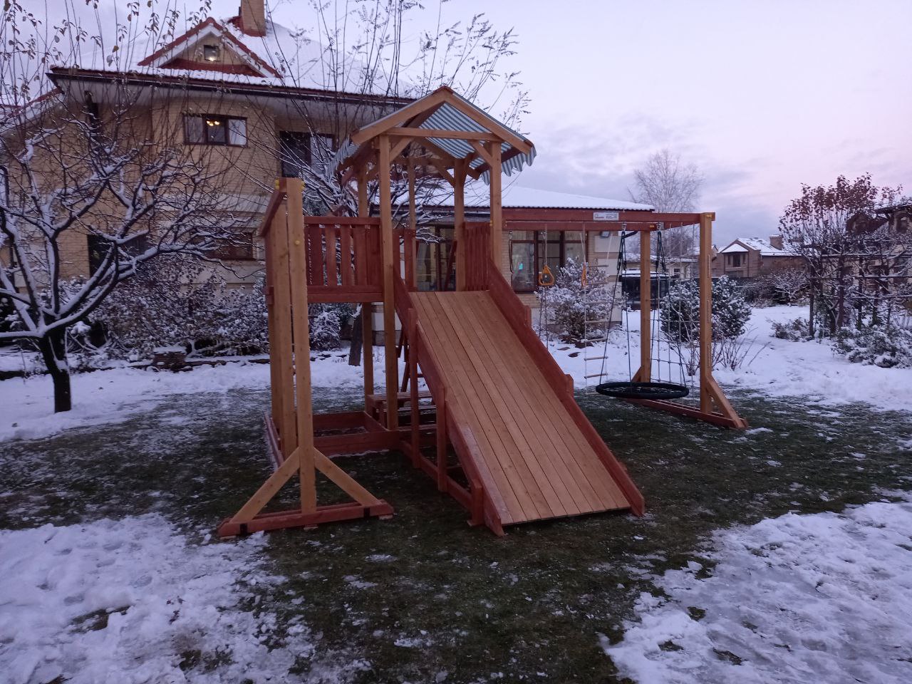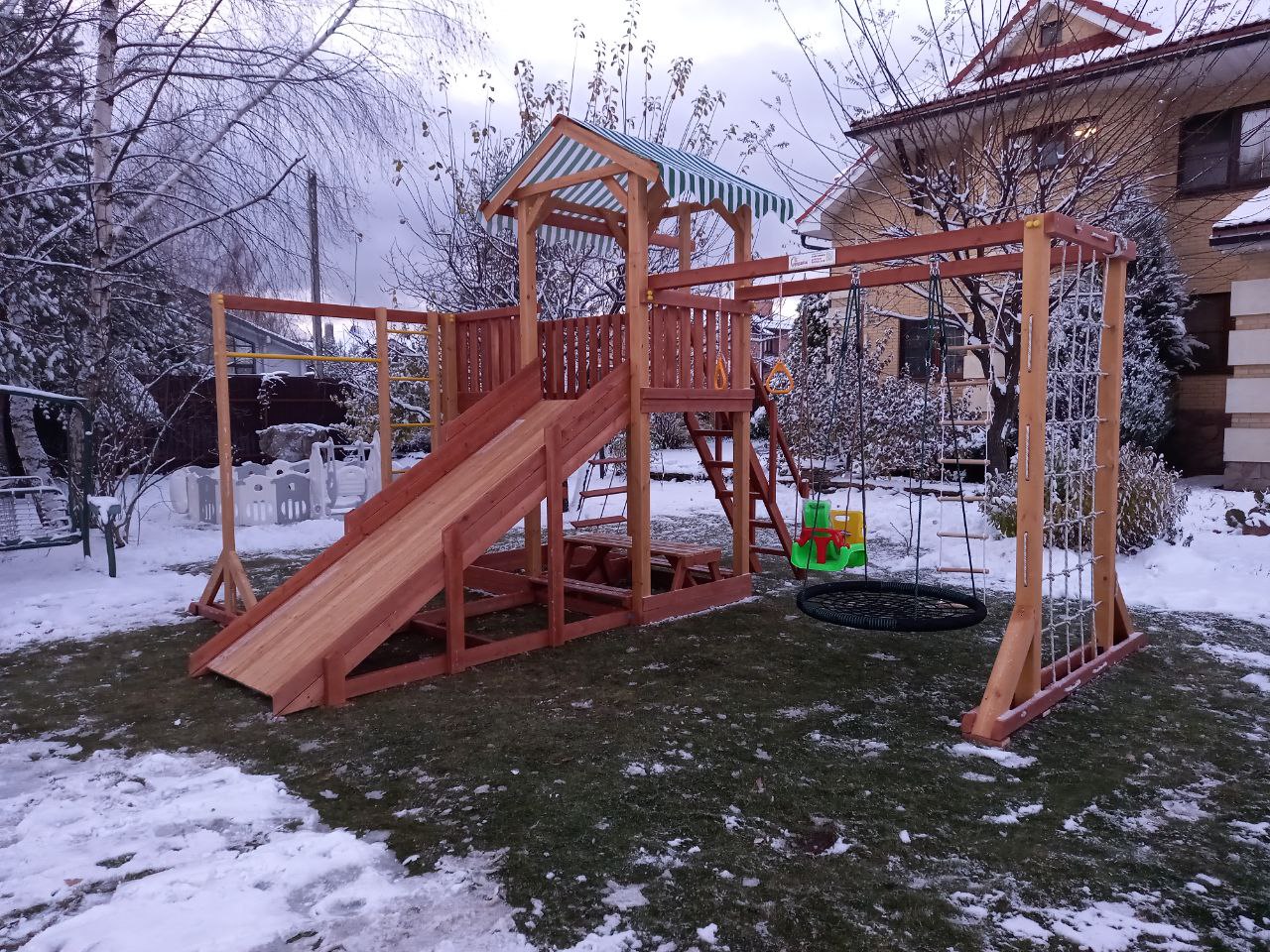 Всепогодный двухуровневый игровой комплекс представляет собой игровую башню, защищенную от солнца и осадков яркой крышей. К башне примыкает увеличенный балкон, вмещающий 2-3 человека. Особенность этой модели - возможность замены летних скалодрома и горки на деревянный скат зимой. Скат превращается в ледяную горку для катания, стоит только залить его водой в мороз или плотно примять выпавший снег. Подняться в башню, неся тюбинг или ледянку, можно по широкой удобной пологой лестнице с перилами.