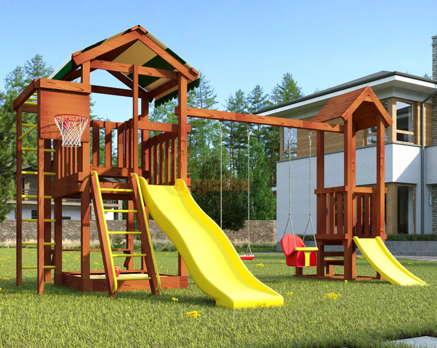 Игровые башни с крышей защищают от солнца и осадков, а материалы комплекса рассчитаны на долгий срок службы без сложного ухода.