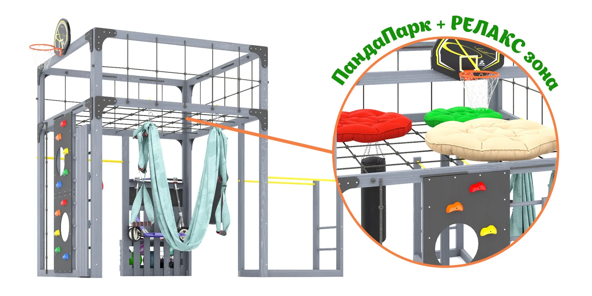- Для всей семьи: Площадка не только для детей, но и для родителей, которым важно проводить время с детьми на свежем воздухе. Гамак для аэро-йоги — идеальный способ расслабиться после активных игр./li>