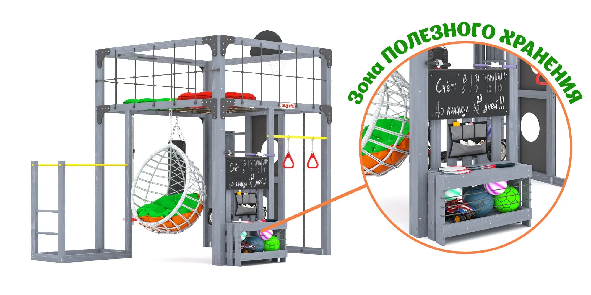 - Зона полезного хранения — места для ковриков, самокатов, мячей и других аксессуаров. Помогает приучить детей к порядку на игровой территории.