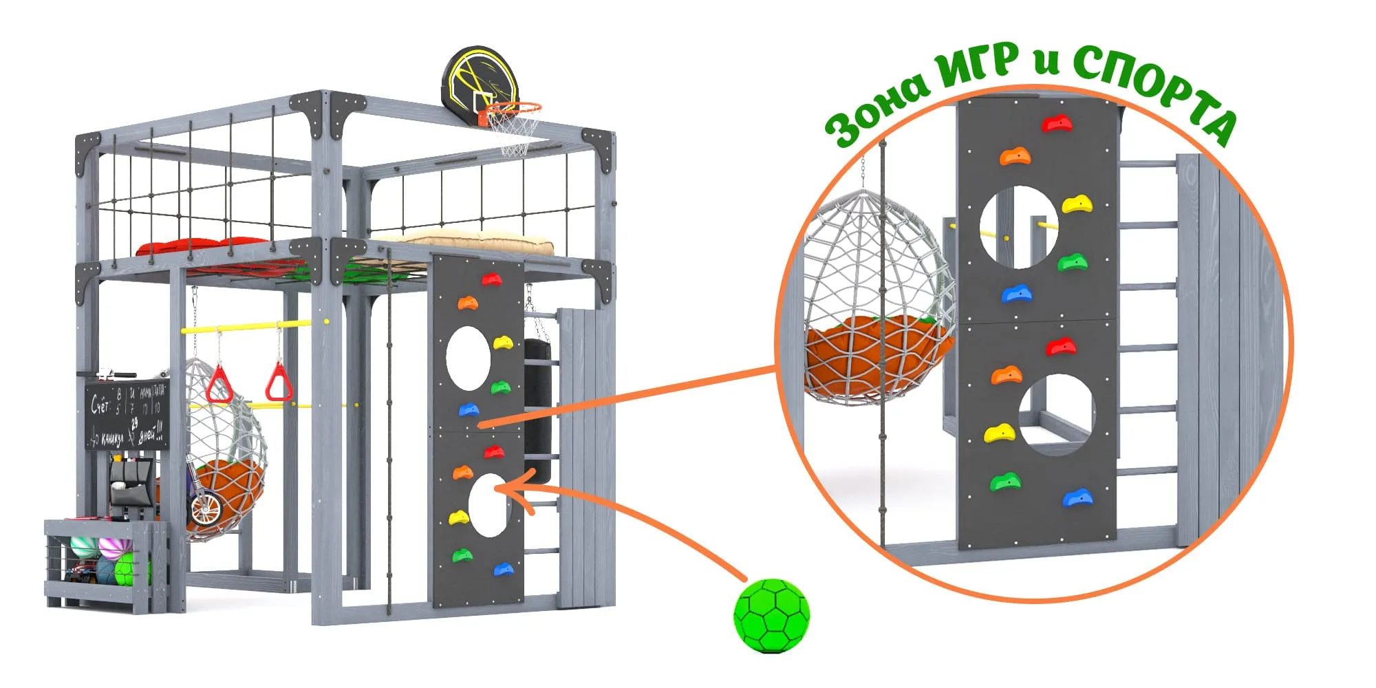 - Многофункциональные элементы: гимнастические кольца, скалодром, боксерская груша, параллельные брусья.
