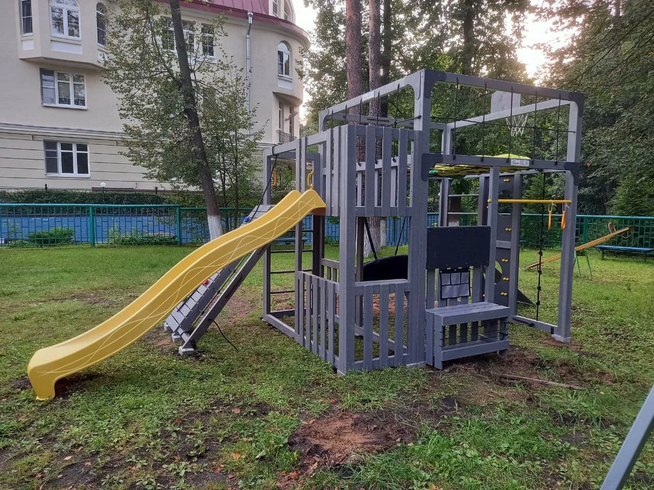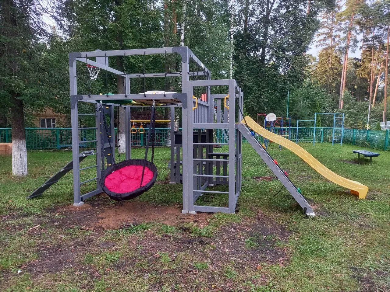 Это не просто площадка — это место, где дети и взрослые вместе играют, тренируются и отдыхают на свежем воздухе. Здесь каждый найдет занятие по душе: от спортивных упражнений до тихого отдыха в подвесном кресле.