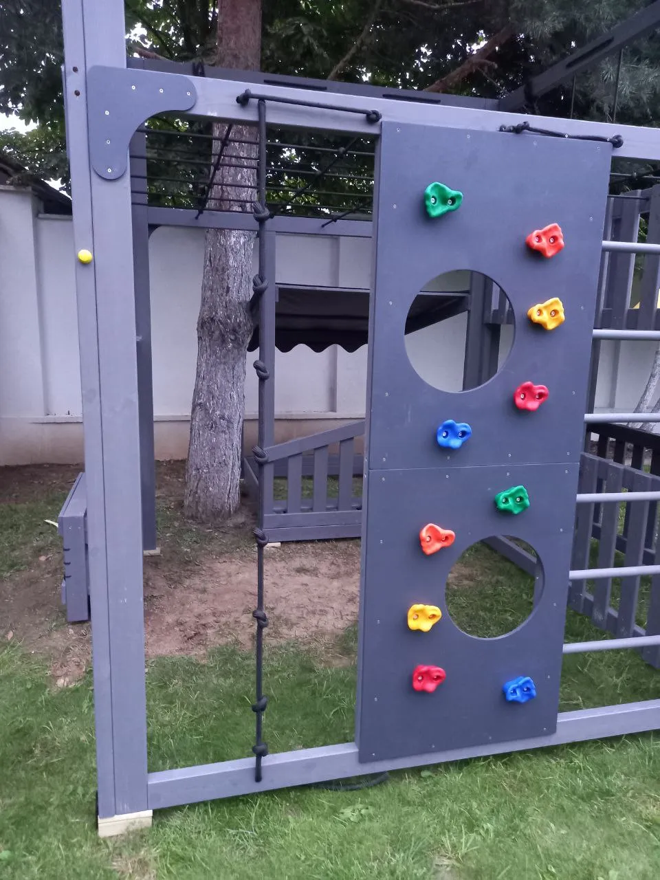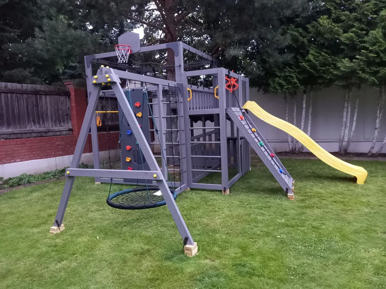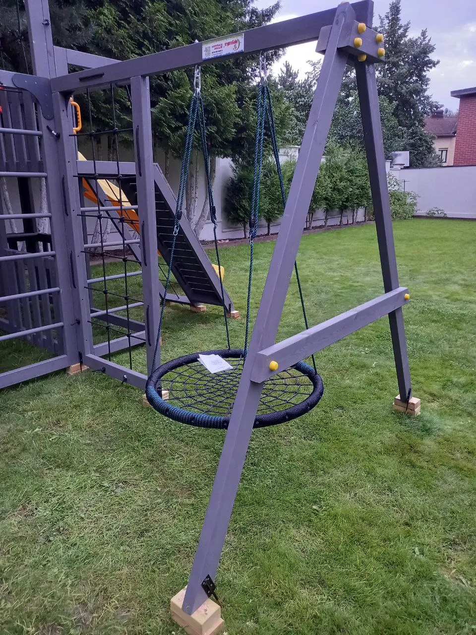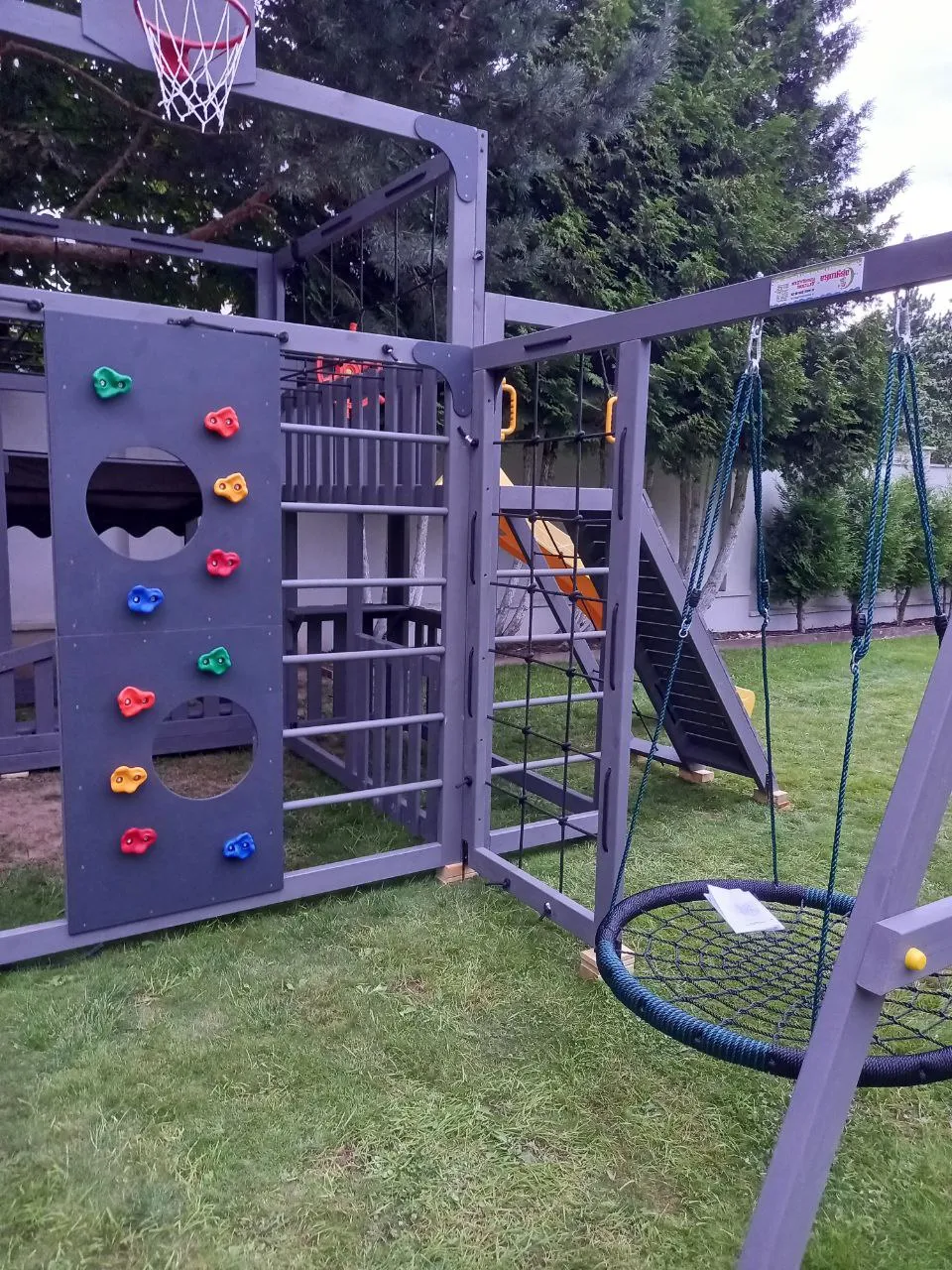 - Два уровня со спортивными элементами: вертикальный и наклонный скалодромы, сетка-лазалка, шведские стенки, турник, гимнастические кольца и баскетбольный щит PROFI — площадка становится местом силы и выносливости.