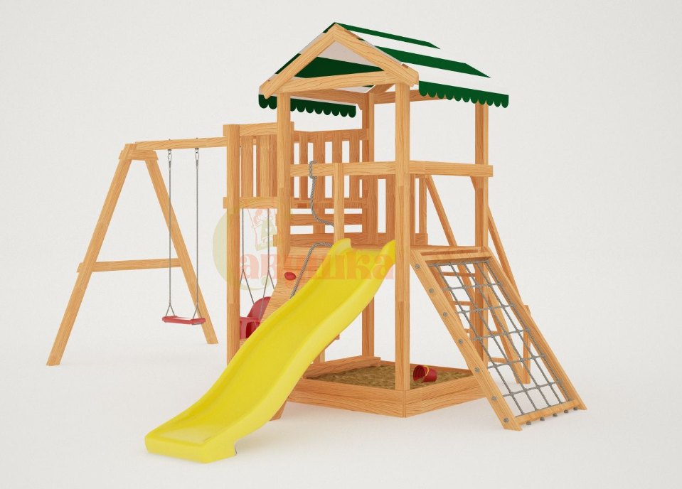 Поднявшись наверх можно поиграть на балкончике, с него будет открываться хороший вид на Ваш дачный участок. А быстро спуститься вниз малышам понравится с горки, цвет пластика на выбор: красный, желтый, зеленый, синий. Под платформой расположена квадратная песочница со сторонами 129 см, где можно более спокойно провести время, а отдохнуть на деревянной лавочке.