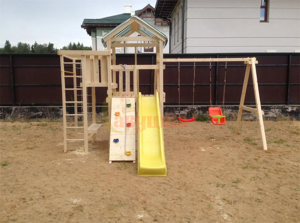 В центре площадки расположена игровая башня, под которой находится удобная песочница с лавочкой. Подняться наверх можно по деревянной лестнице или скалодрому с удобными зацепами и канатом. На башне есть балкончик, с которого открывается прекрасный вид на ваш участок.