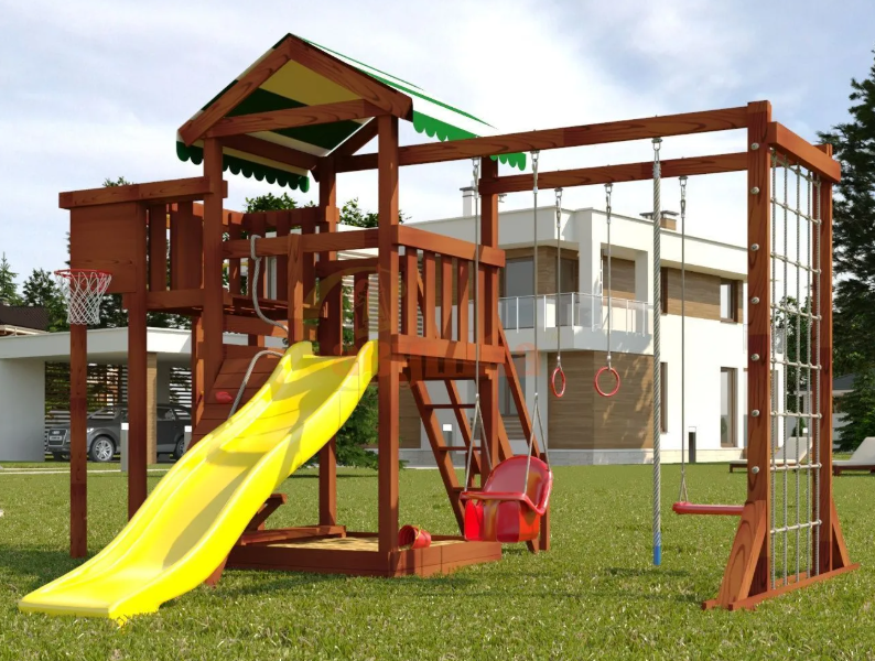 Укреплять мышечный каркас нужно с детства, бросая мяч в баскетбольное кольцо, вися на турнике и кольцах, карабкаясь по шведской стенке, канату, сетке-лазалке. Все это многообразие спортивных снарядов присутствует в «Мастер» #4. Для большей радости качели «Лодочка» и «Люкс» со спинкой. Наслаждайтесь и развивайтесь безопасно с игровым уличным комплексом Савушка.