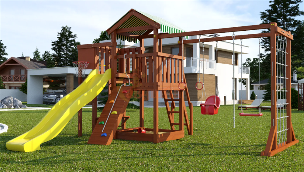 Безопасность – главный приоритет при установке детской игровой конструкции. В производстве используется клееный брус, который обладает высокой прочностью и надежностью. Все материалы сертифицированы и покрыты экологически безопасным лакокрасочным составом Sherwin-Williams. Это покрытие соответствует строгим стандартам безопасности и разрешено для использования на детских площадках.