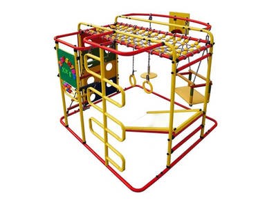Комплектация ДСКтарзанка, веревочная лестница, качели, сетка для лазания, панель с отверстиями, горка, баскетбольное кольцо, мольберт со счетами, кольца