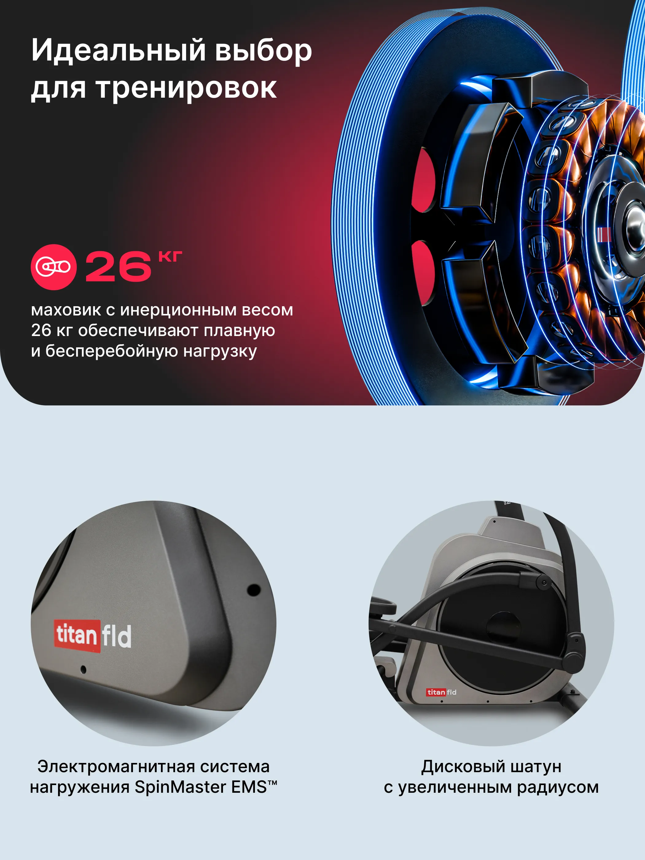 Высокопрочная рама с антикоррозийной обработкой и двухслойной покраской гарантирует долговечность тренажера. TITAN FLD имеет электромагнитную систему нагружения SpinMaster EMS™, предлагающую 16 уровней нагрузки, что позволяет адаптировать тренировки под любые уровни подготовки. Инерционный вес маховика составляет 26 кг, что обеспечивает плавность и комфорт во время занятий.