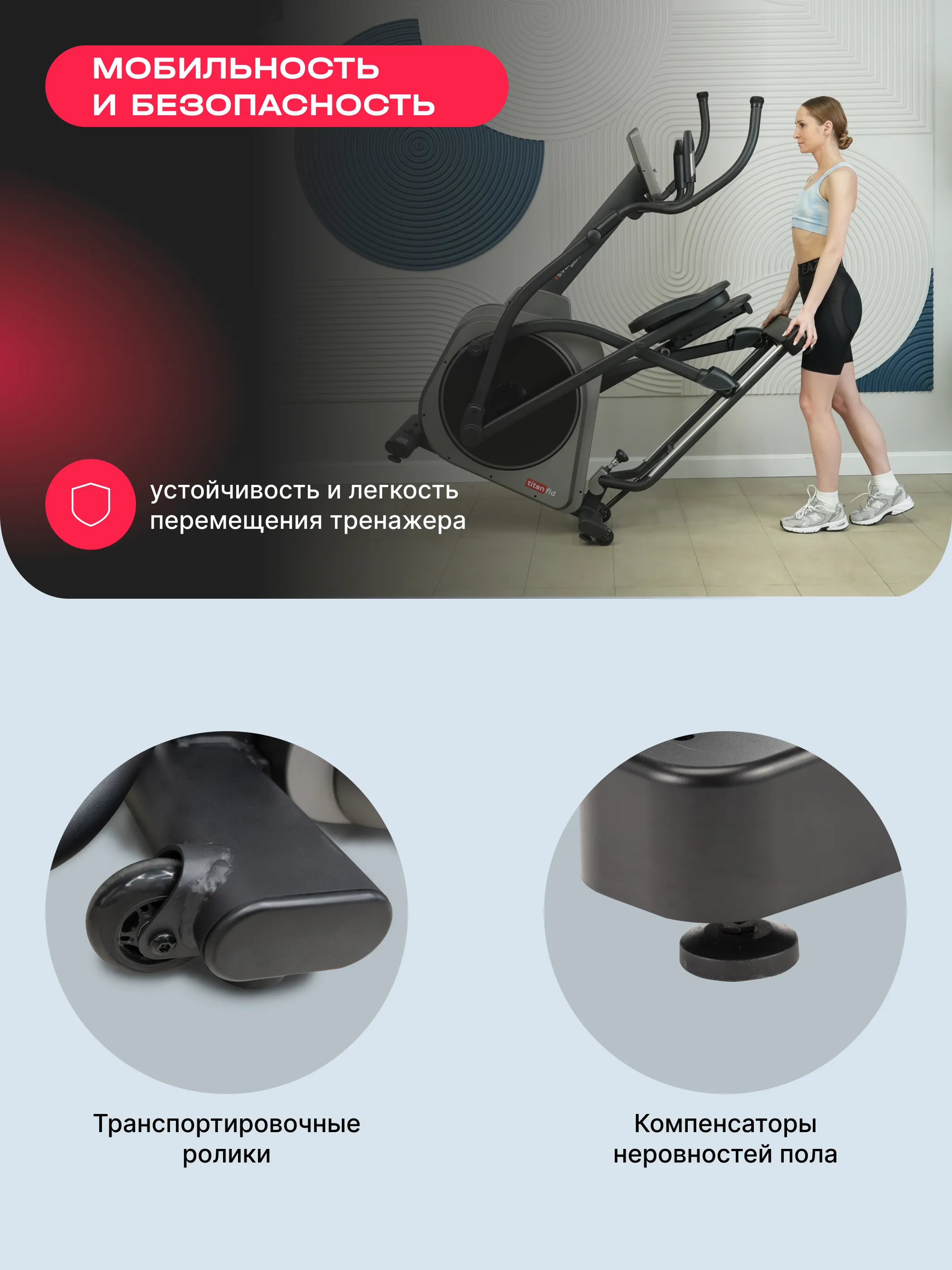 • компактность и мобильность: складная конструкция и транспортировочные ролики позволяют легко хранить тренажер и перемещать его по дому;
