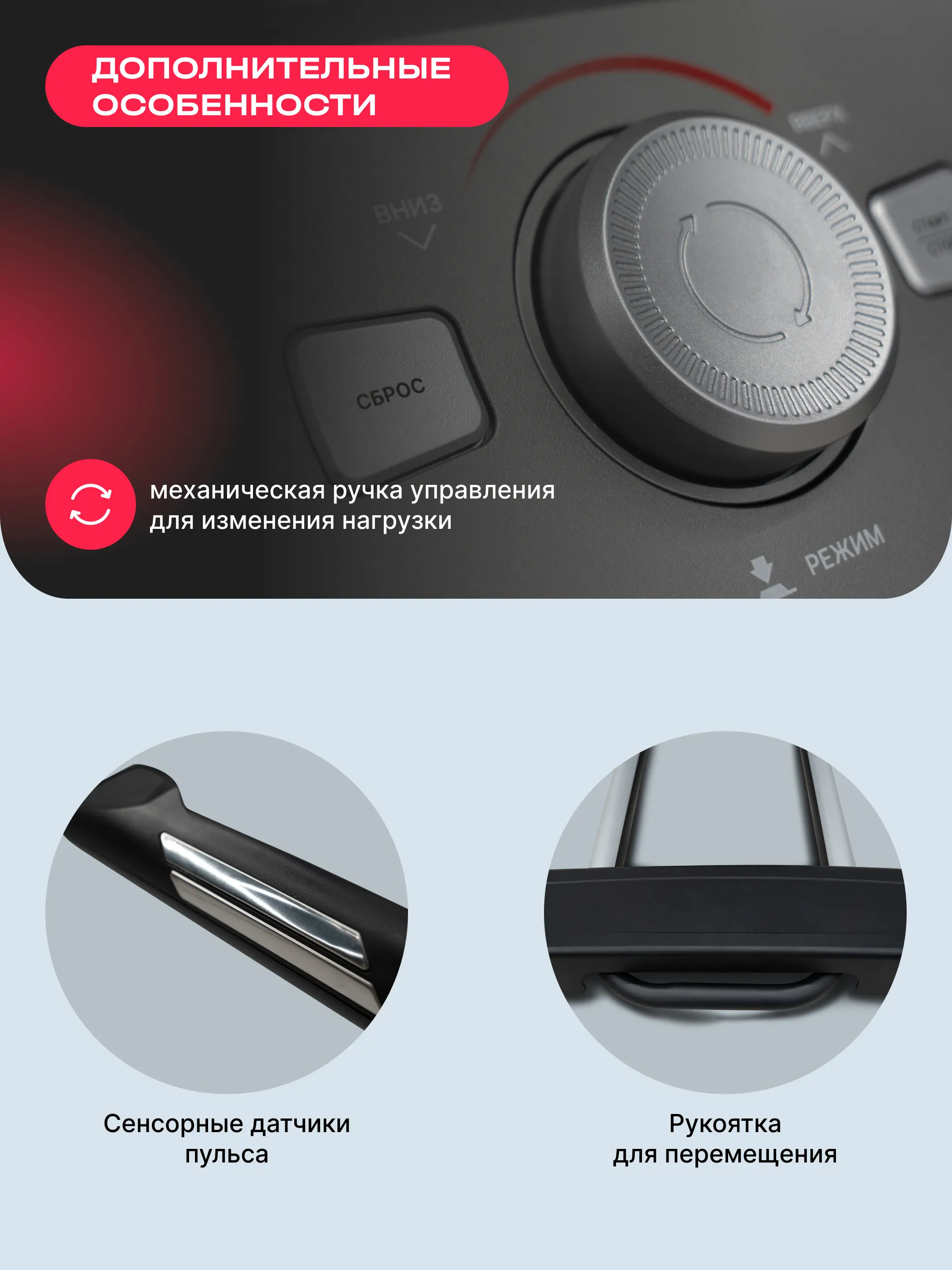 • комфорт и удобство: антискользящие и увеличенного размера педали, сенсорные датчики на поручнях и возможность подключения к кардиодатчикам делают тренировки безопасными и эффективными;