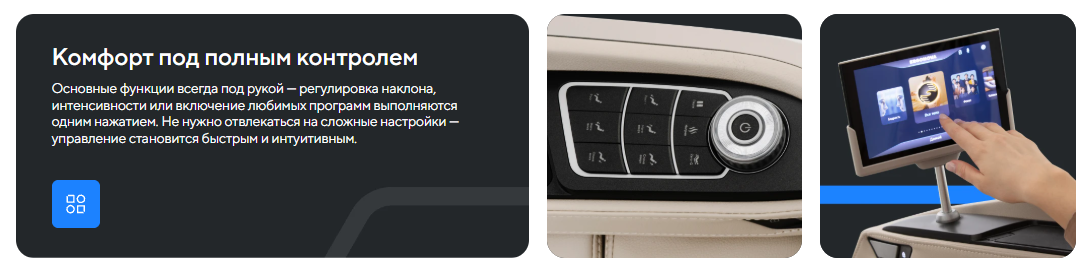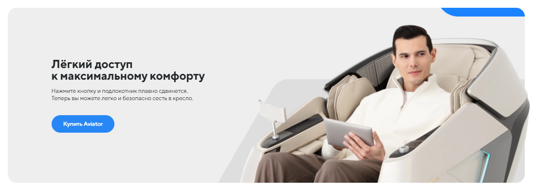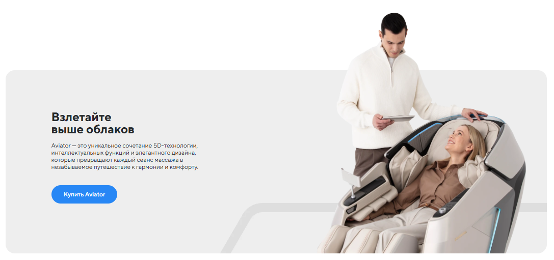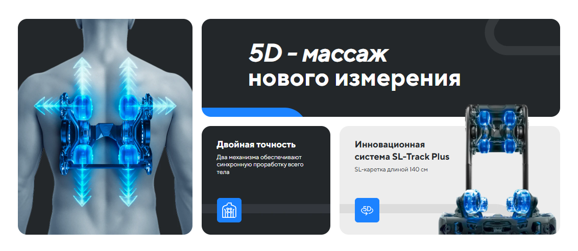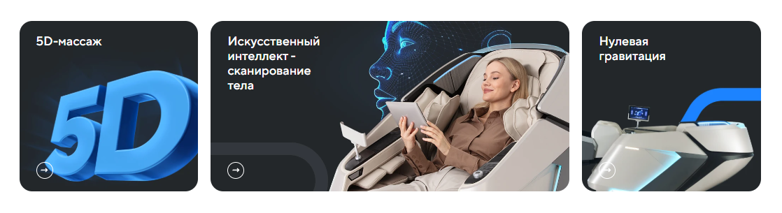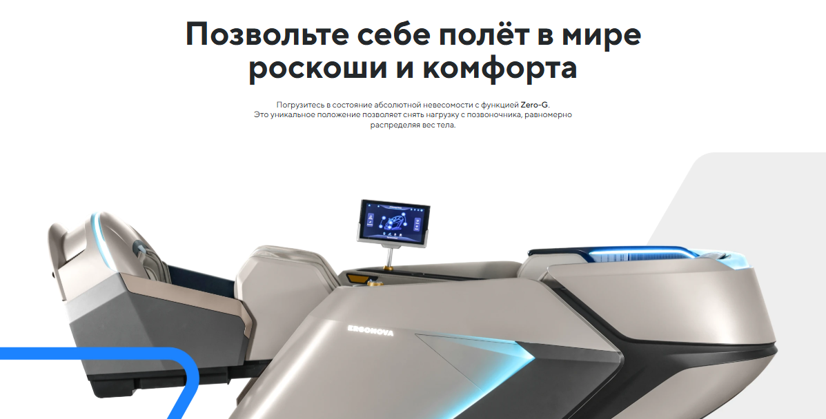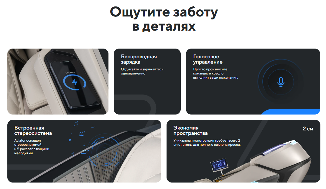 | Функционал | Голосовое управление, Растяжка спины, Функция невесомости (Zero G), Сканирование состояния на базе ИИ, Люминотерапия, Ароматерапия, Прослушивание музыки через Bluetooth, Запоминание программ, Панель быстрого доступа, Беспроводная зарядка для телефона, USB-зарядка для телефона |