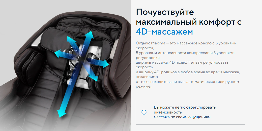 Флагманское кресло в серии Organic обеспечивает невероятный массаж благодаря сочетанию высоких технологий и 4D массажа. Organic приглашает вас испытать это на себе и почувствовать неповторимые ощущения от массажа!