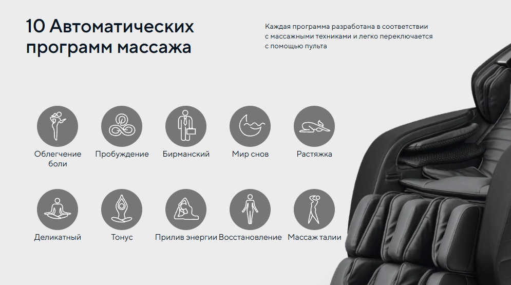 | Функционал | Голосовое управление, Растяжка спины, Функция невесомости (Zero G), Прослушивание музыки через Bluetooth |