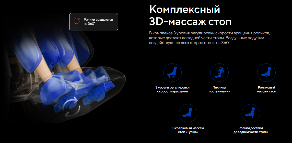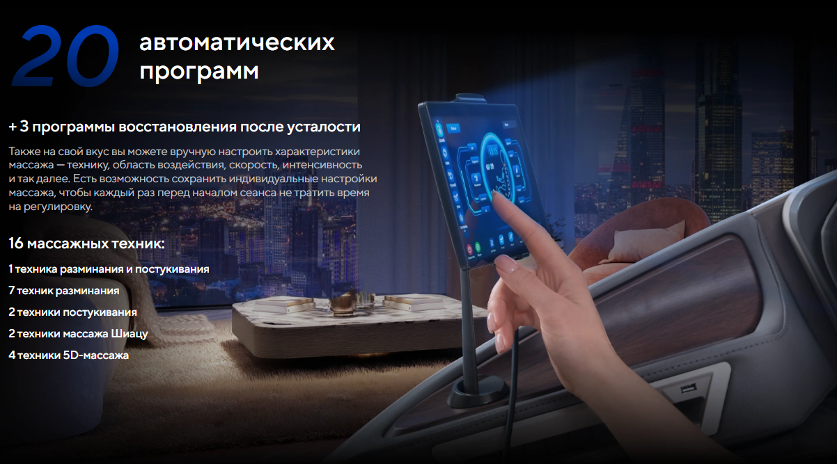 | Ручные программы | 4 техники 5D-массажа, Стоп, Разминание, 2 техники постукивания, Разминание и похлопывание, Шиацу (2 режима), Схватывание |