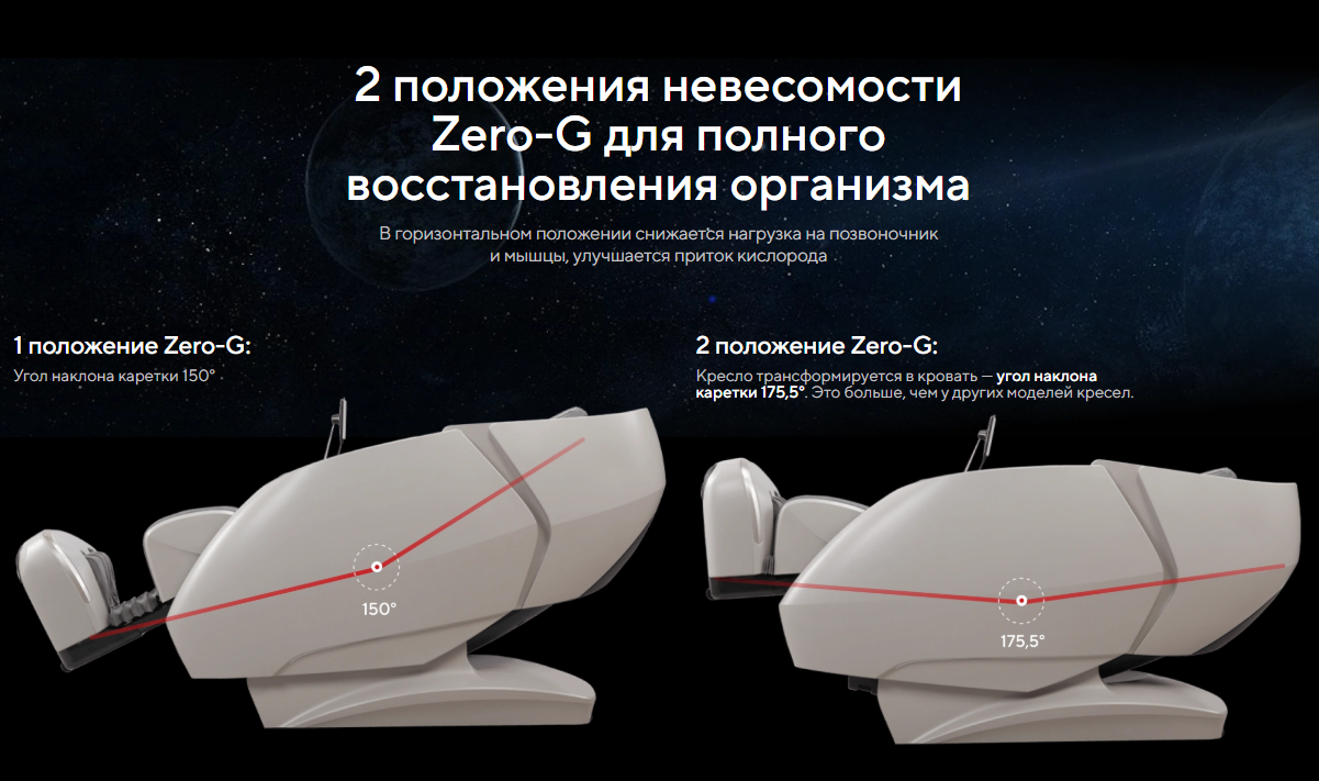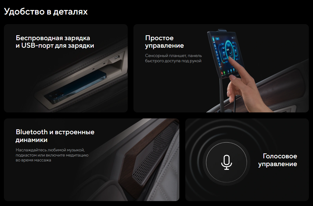 | Функционал | Голосовое управление, Растяжка спины, Функция невесомости (Zero G), Биосенсор для индивидуального массажа, Прослушивание музыки через Bluetooth, Запоминание программ, Панель быстрого доступа, Беспроводная зарядка для телефона, USB-зарядка для телефона |