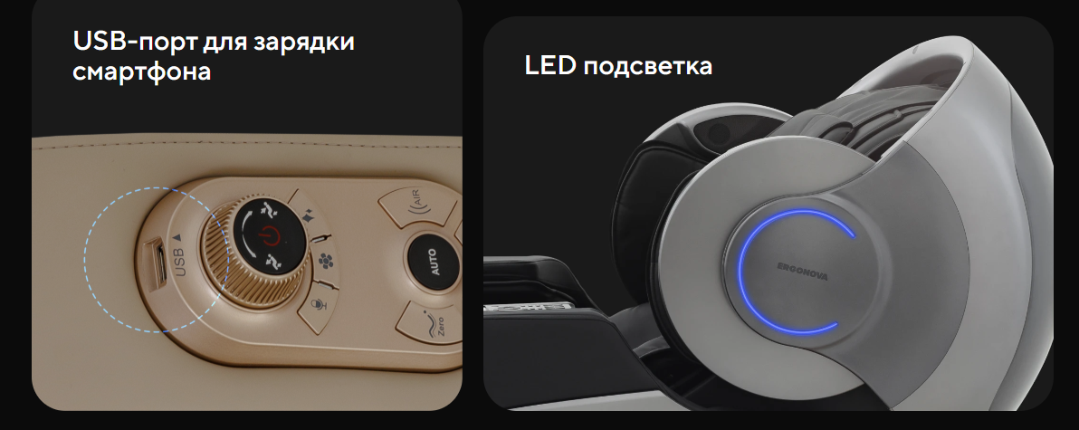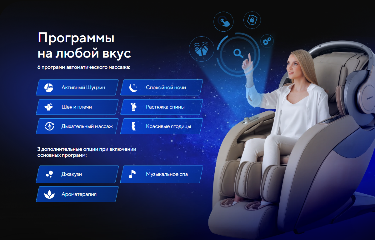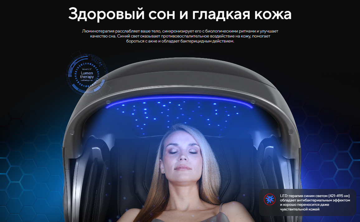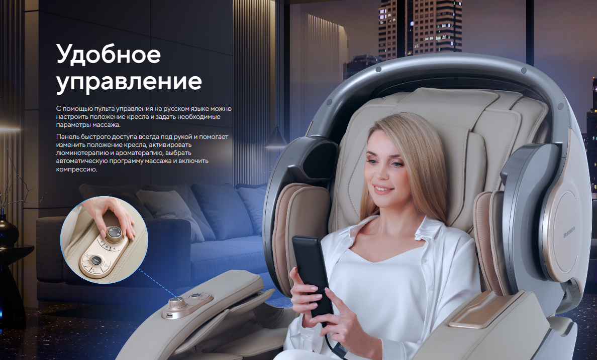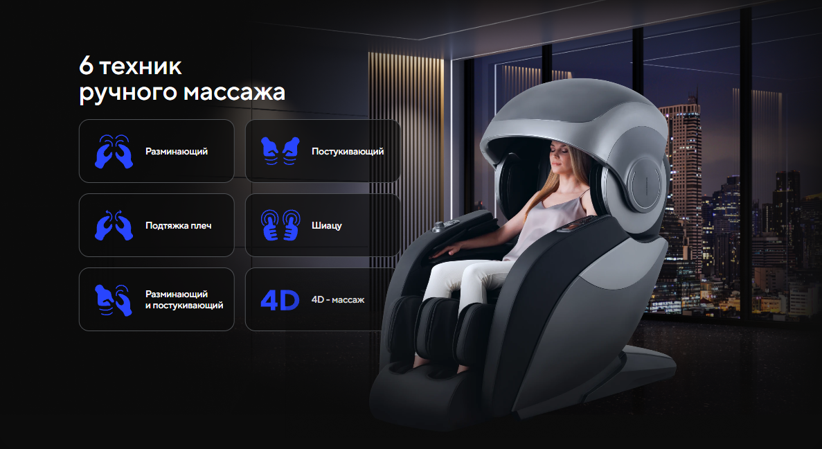 | Функционал | Голосовое управление, Растяжка спины, Функция невесомости (Zero G), Люминотерапия, Ароматерапия, Прослушивание музыки через Bluetooth, Панель быстрого доступа, USB-зарядка для телефона |