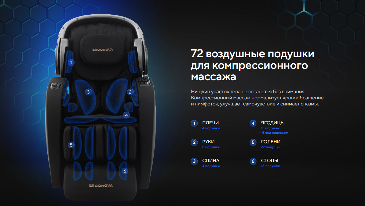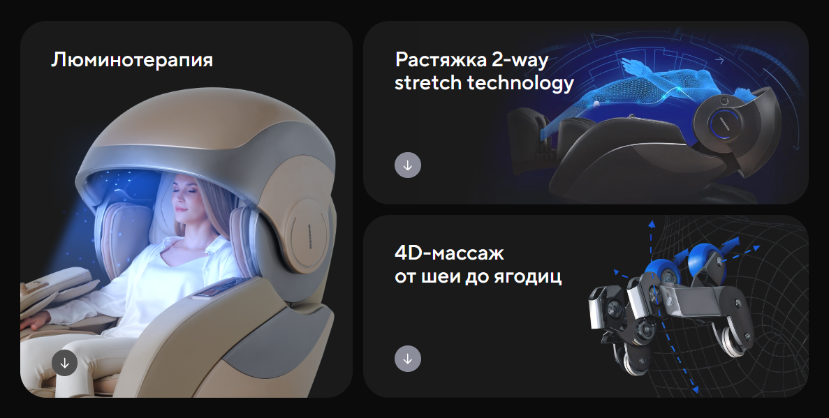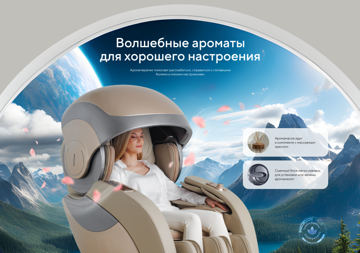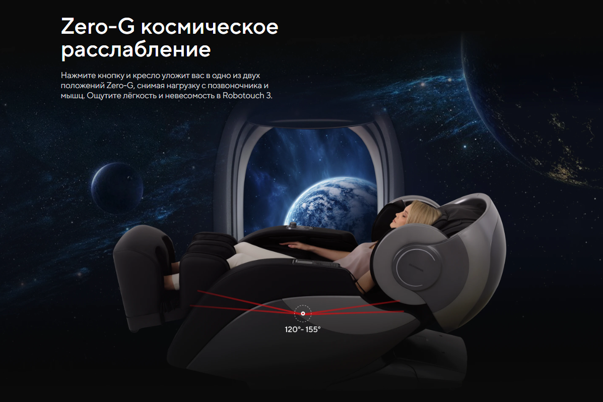 | Функционал | Голосовое управление, Растяжка спины, Функция невесомости (Zero G), Люминотерапия, Ароматерапия, Прослушивание музыки через Bluetooth, Панель быстрого доступа, USB-зарядка для телефона |