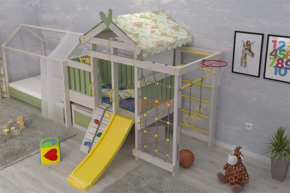 Это универсальный спортивно-игровой комплекс для очень активных детей. Для игр мы предусмотрели уютный домик с крышей и полупрозрачным тюлем белого цвета. Он стоит на платформе высотой 60 см. Чтобы попасть в него вашим малышам потребуется проявить смелость и упорство. Надо преодолеть мини-скалодром с канатом и пластиковыми зацепами- отличная тренировка для мышц и развития координации.