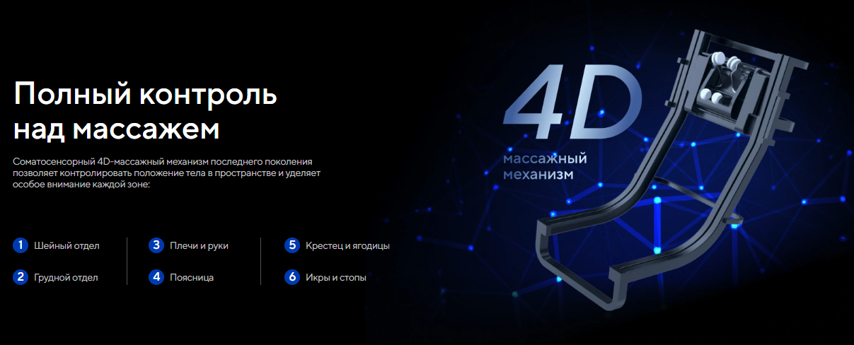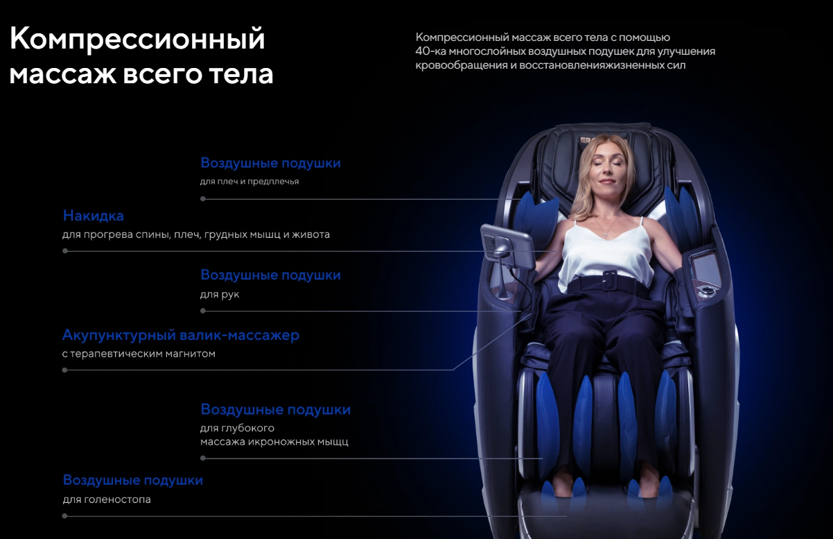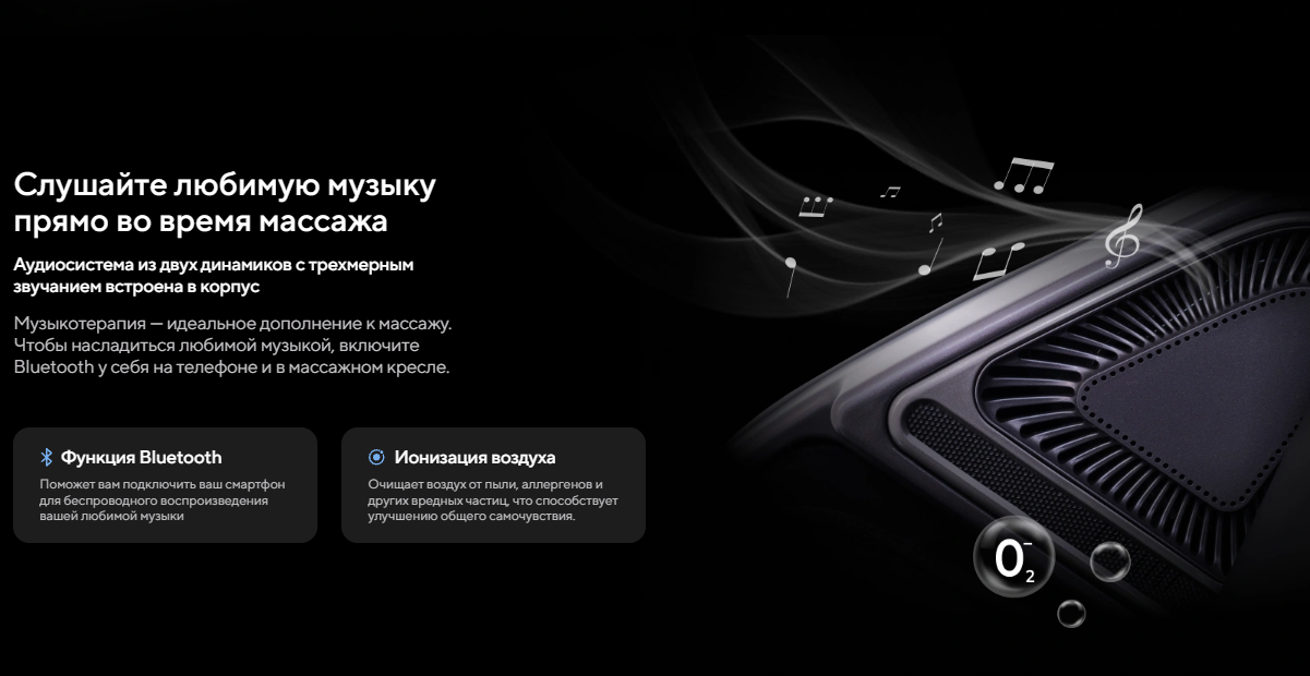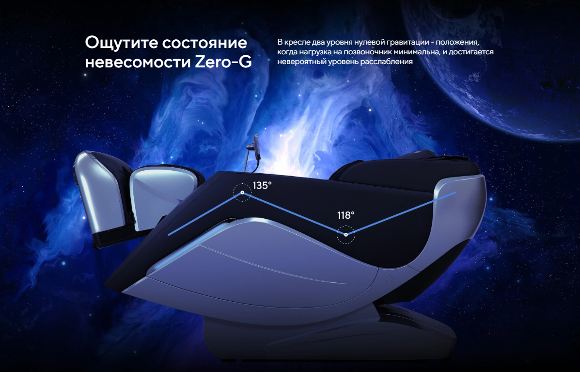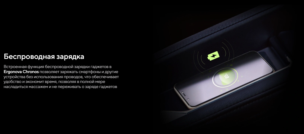 Функционал | Голосовое управление, Растяжка спины, Функция невесомости (Zero G), Прослушивание музыки через Bluetooth, Запоминание программ, Панель быстрого доступа, Беспроводная зарядка для телефона |