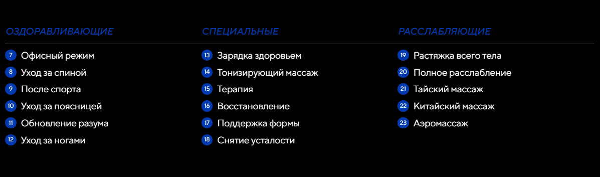Ручные программы | Разминание (7 режимов), Постукивание (2 режима), Разминание и постукивание, Шиацу (2 режима), 4D массаж (4 режима), Массаж плеч |
