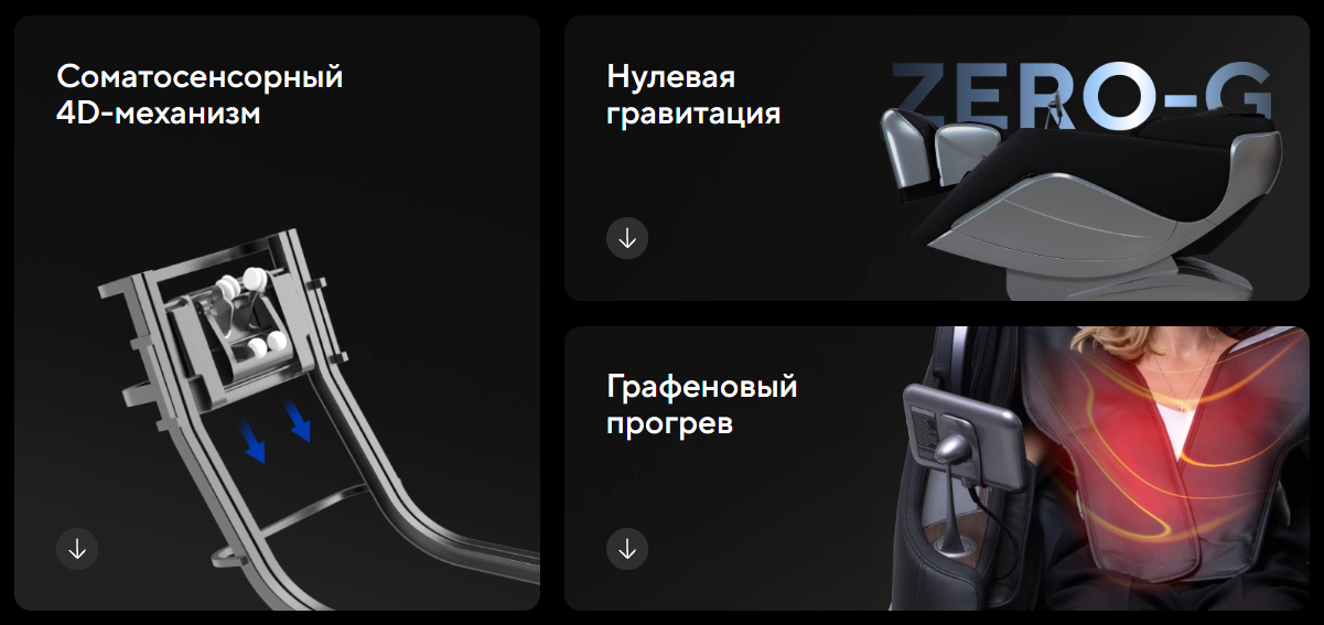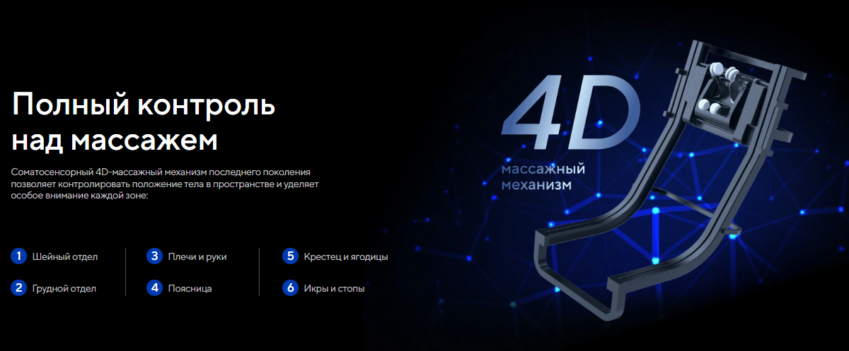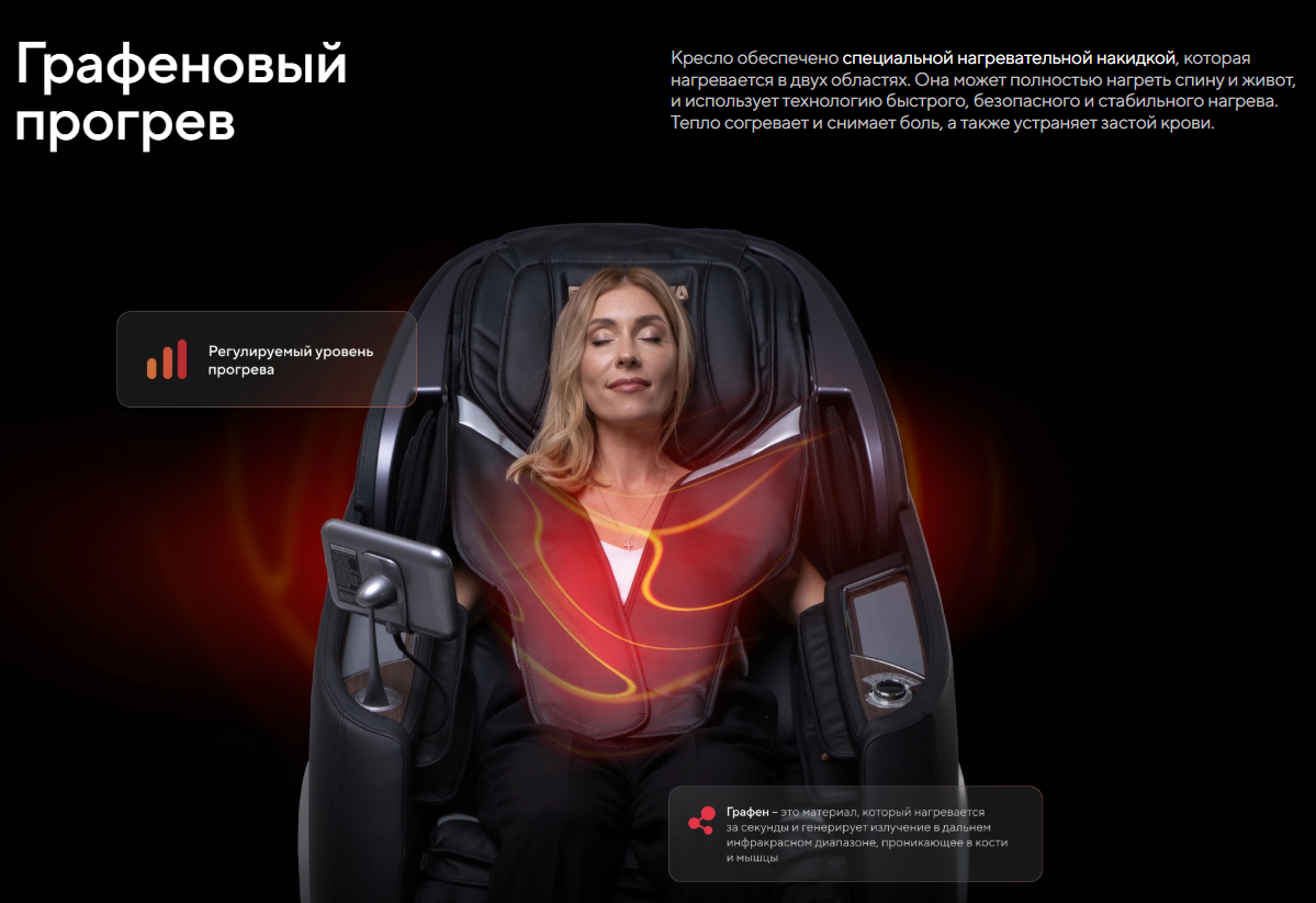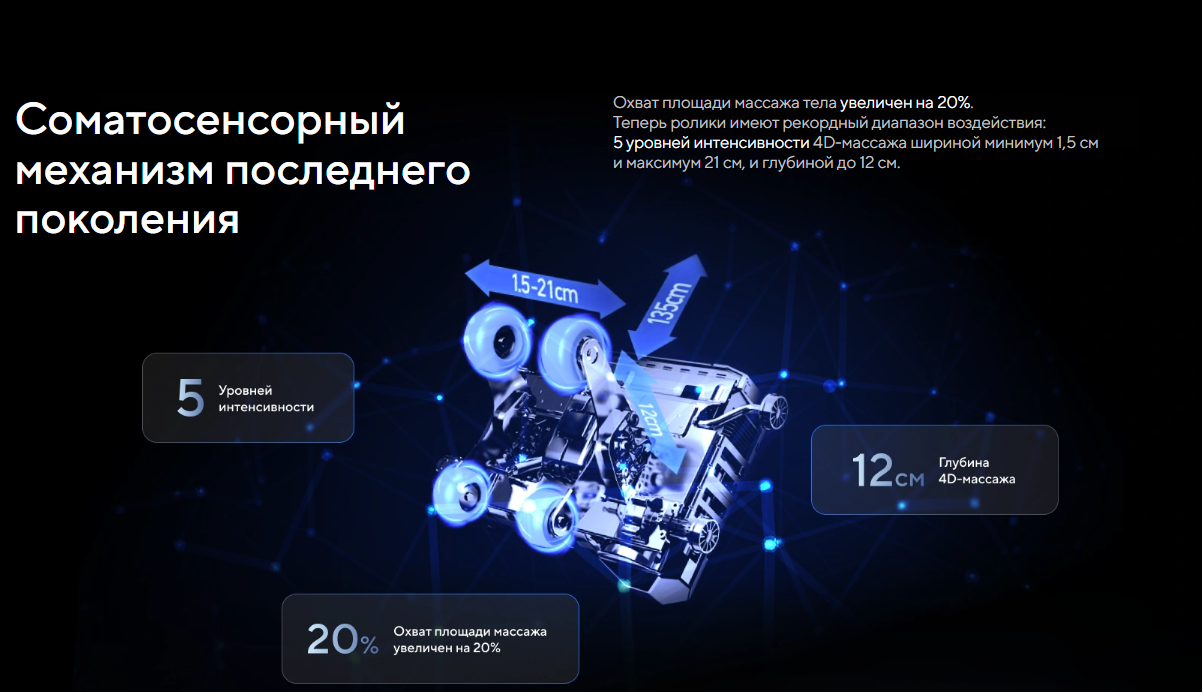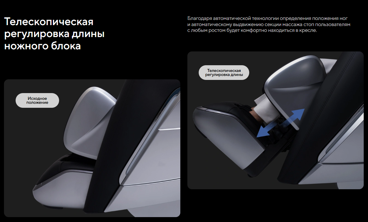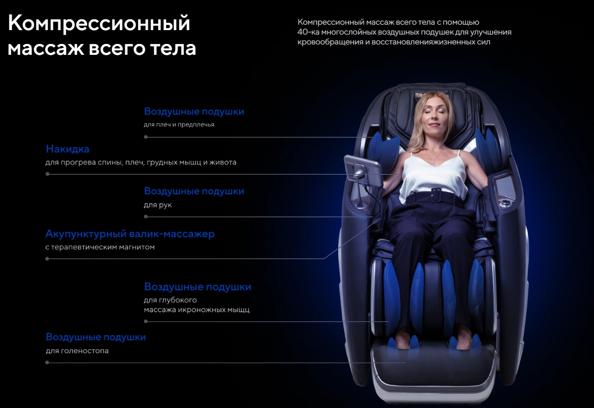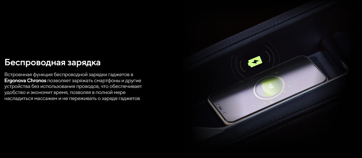 Функционал | Голосовое управление, Растяжка спины, Функция невесомости (Zero G), Прослушивание музыки через Bluetooth, Запоминание программ, Панель быстрого доступа, Беспроводная зарядка для телефона |