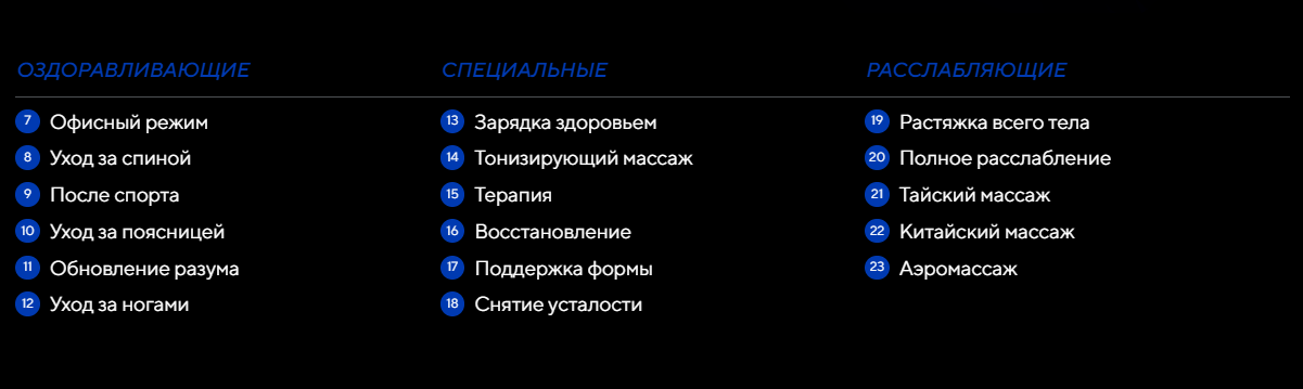 Ручные программы | Разминание (7 режимов), Постукивание (2 режима), Разминание и постукивание, Шиацу (2 режима), 4D массаж (4 режима), Массаж плеч |