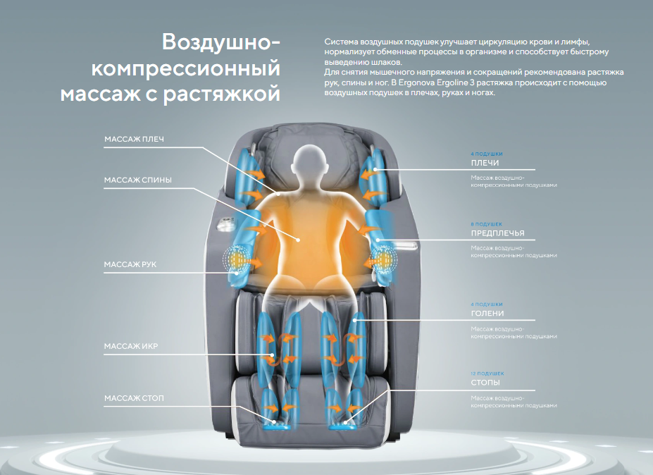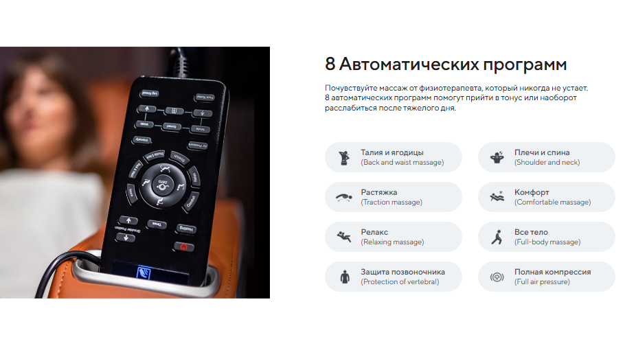 | Автоматические программы | Комфорт, Расслабление, Растяжение, Массаж плеч и шеи, Массаж спины и поясницы, Массаж всего тела, Мануальный массаж, Воздушно-компрессионный массаж всего тела |