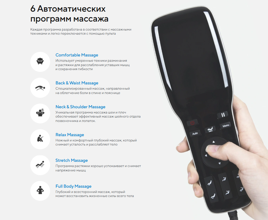 | Автоматические программы | Комфорт, Расслабление, Растяжка, Массаж плеч и шеи, Массаж спины и поясницы, Массаж всего тела |