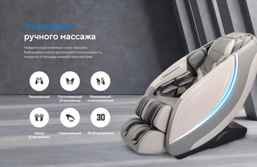 | Ручные программы | Разминающий, Постукивающий (2 программы), Разминающий и постукивающий, Шиацу (2 режима), Схватывающий, 3D (4 программы) |