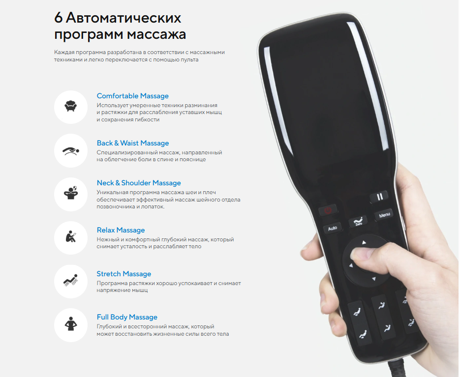 Автоматические программы | Комфорт, Расслабление, Растяжка, Массаж плеч и шеи, Массаж спины и поясницы, Массаж всего тела |