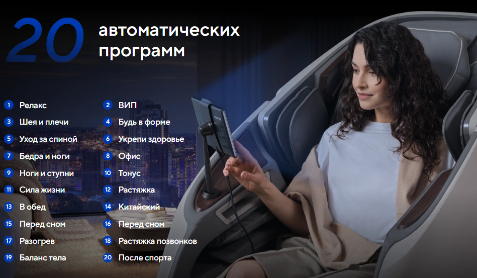 Автоматические программы | Релакс, Шея и плечи, Уход за спиной, Бедра и ноги, Ноги и ступни, Сила жизни, В обед, Перед сном, Разогрев, Баланс тела, Вип, Будь в форме, Укрепи здоровье, Офис, Тонус, Растяжка, Китайский, Растяжка Тай, Растяжка позвонков, После спорта |