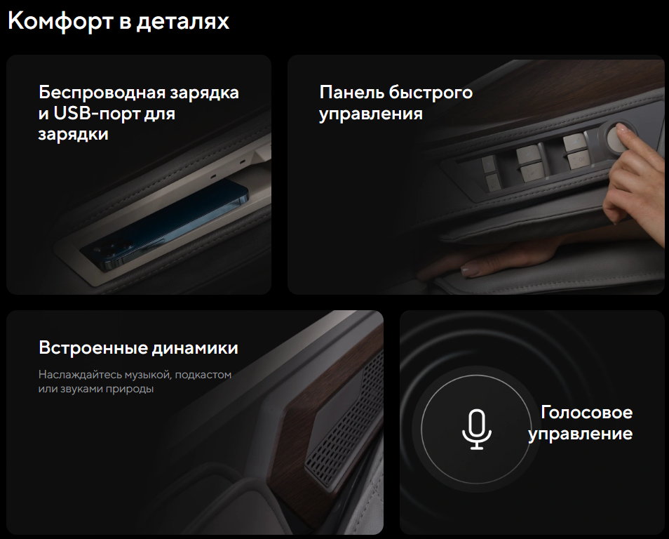 Функционал | Голосовое управление, Растяжка спины, Функция невесомости (Zero G), Биосенсор для индивидуального массажа, Прослушивание музыки через Bluetooth, Запоминание программ, Панель быстрого доступа, Беспроводная зарядка для телефона, USB-зарядка для телефона |