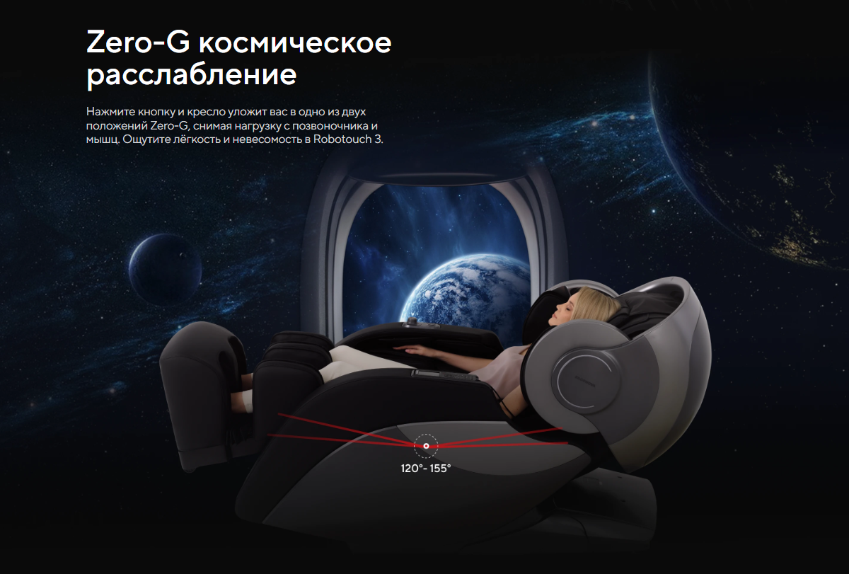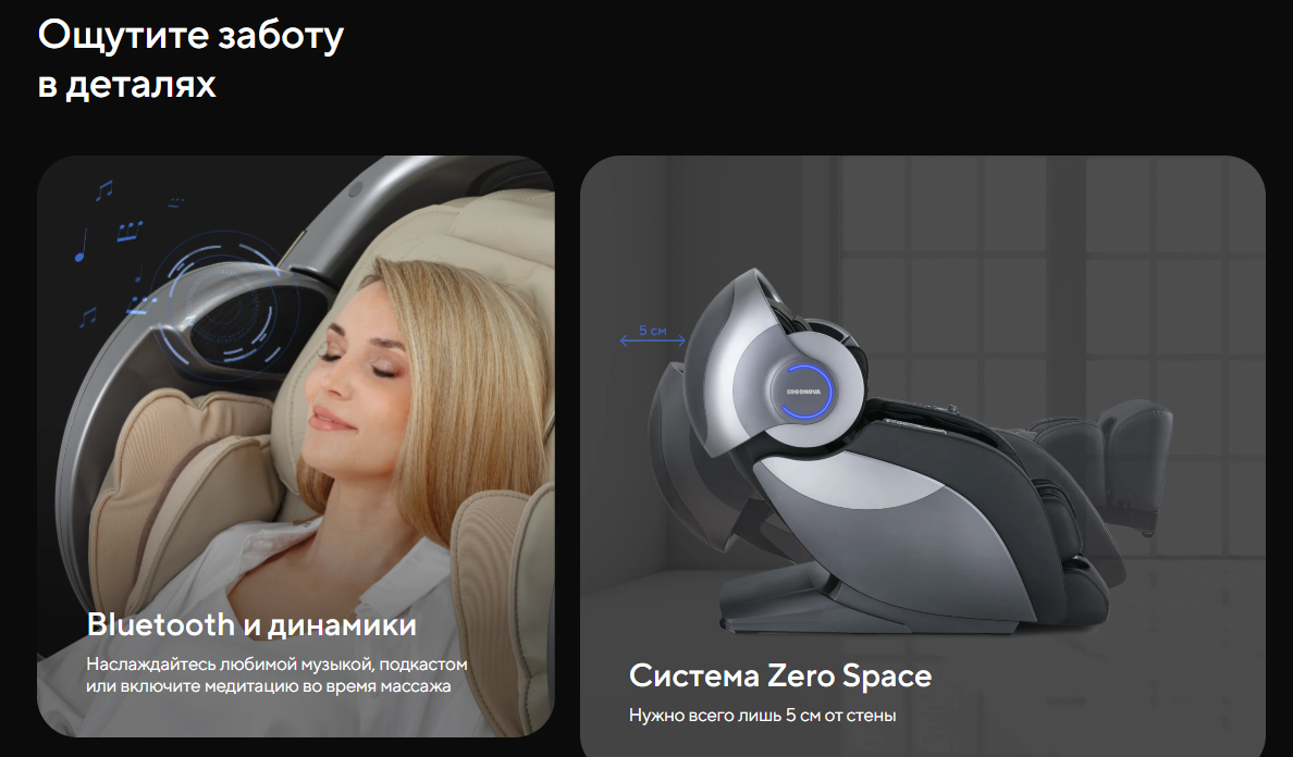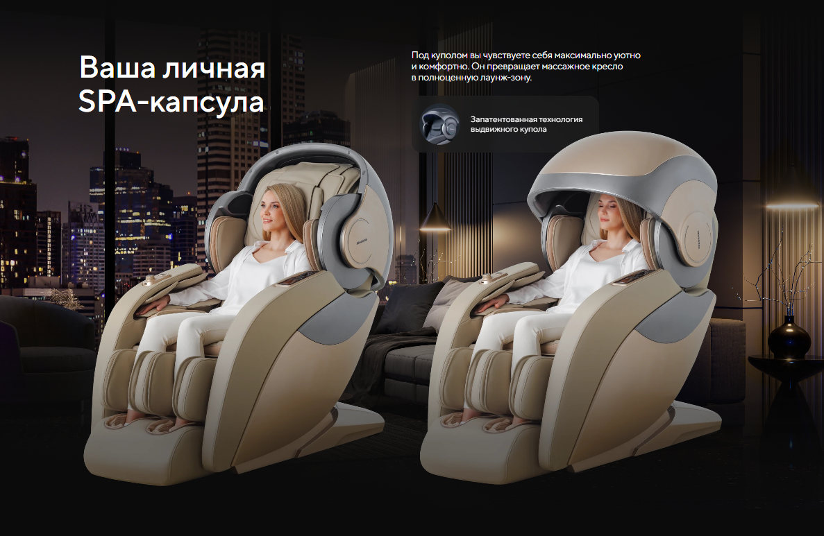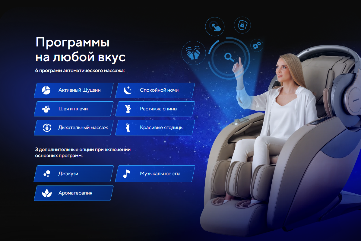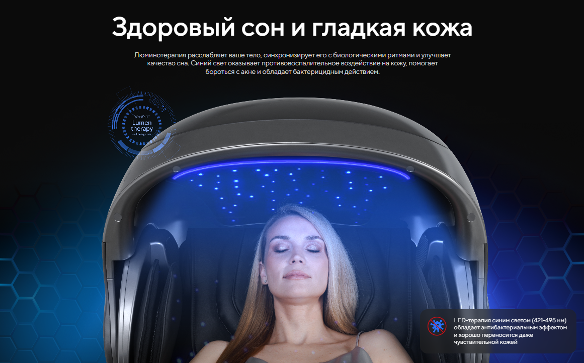 | Функционал | Голосовое управление, Растяжка спины, Функция невесомости (Zero G), Люминотерапия, Ароматерапия, Прослушивание музыки через Bluetooth, Панель быстрого доступа, USB-зарядка для телефона |