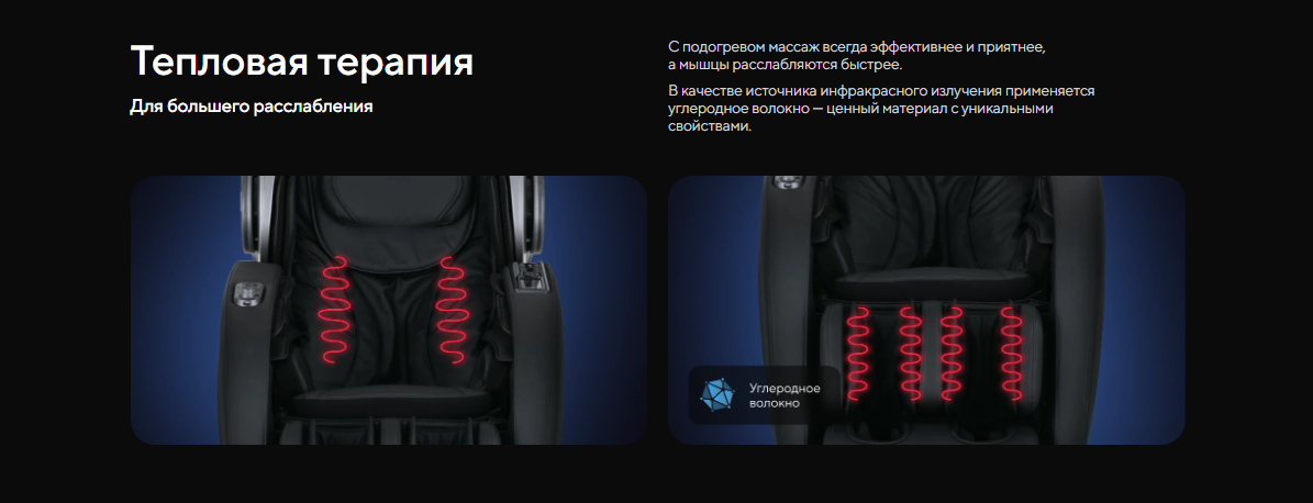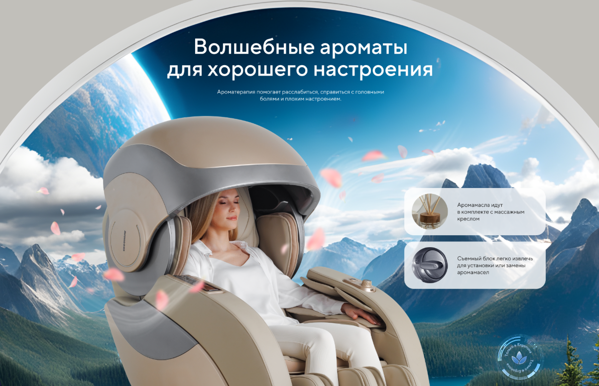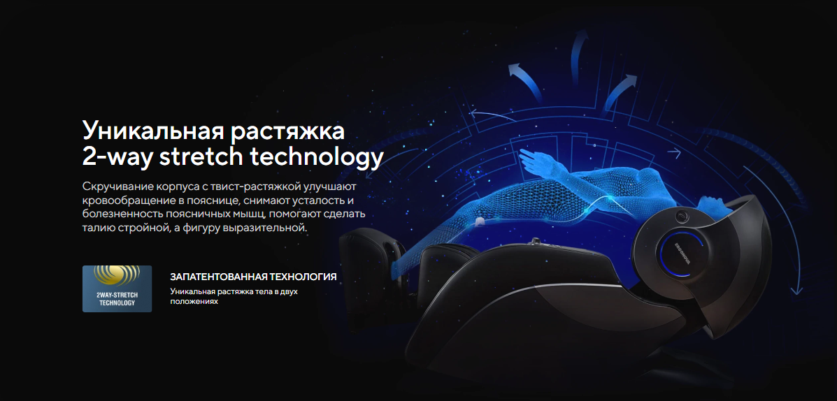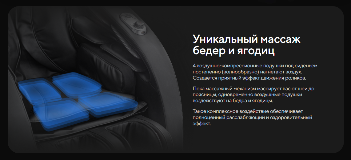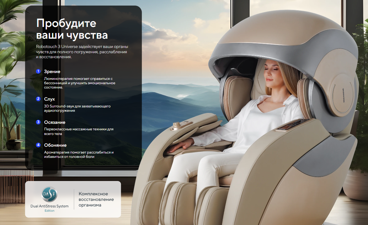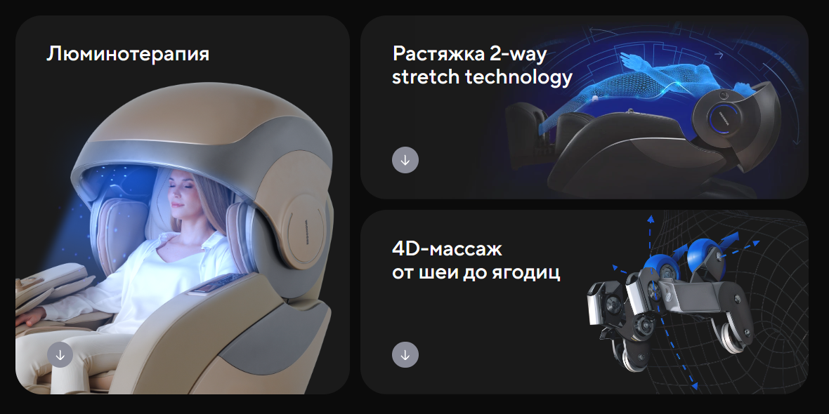 | Функционал | Голосовое управление, Растяжка спины, Функция невесомости (Zero G), Люминотерапия, Ароматерапия, Прослушивание музыки через Bluetooth, Панель быстрого доступа, USB-зарядка для телефона |