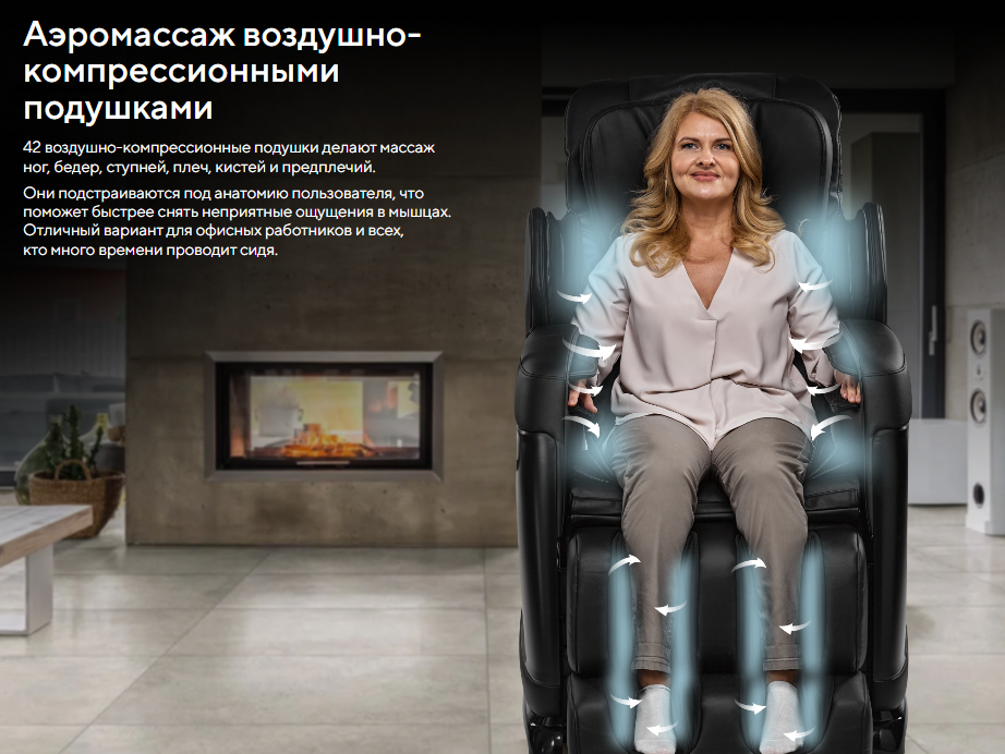 Встроенная система термотерапии расслабляет и успокаивает напряженные мышцы быстрее, подарит комфорт на протяжении всего сеанса