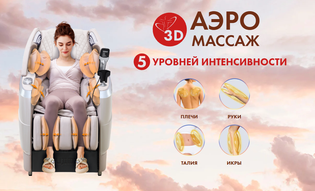 - Охватывающий аэромассаж всего тела выполняется многокамерными подушками 3D VOLUMETRIC AIR