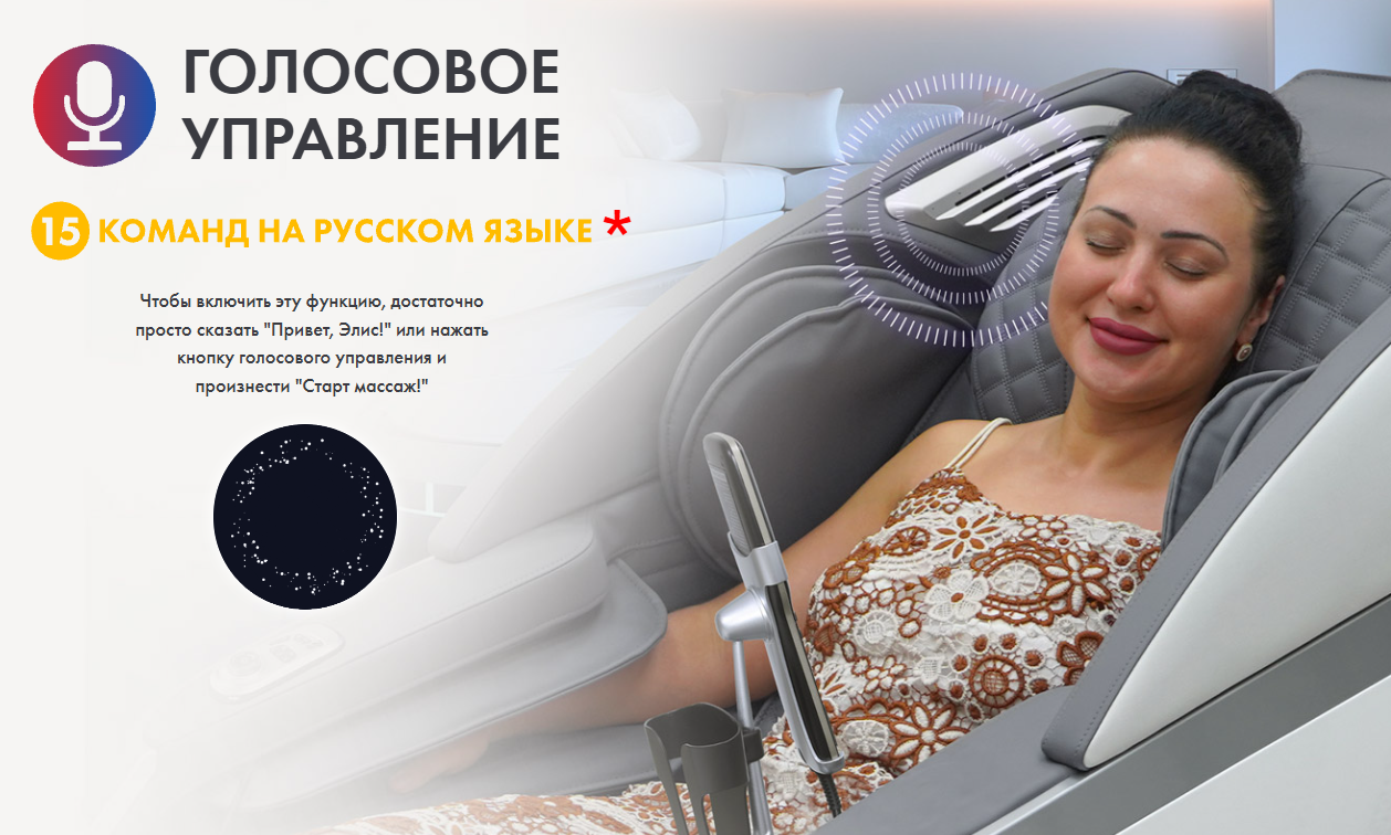 - Голосовой контроль на русском языке* облегчает управление массажем