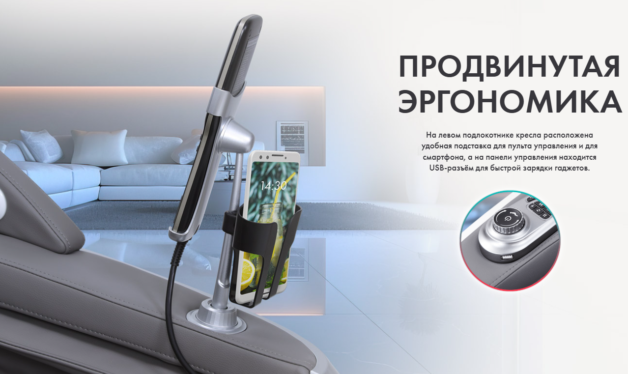 - Эргономика массажного кресла дополнена удобной подставкой пульта на левом подлокотнике