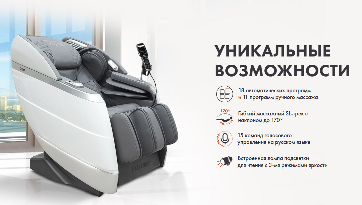 * Примечание 1: Распознавание голосовых команд кресла 氣 FLEXOR настроено на стандартный русский диалект и может не распознавать команды конкретного пользователя. В таких случаях, компания FUJIMO рекомендует использовать пульт управления с удобным русифицированным интерфейсом.