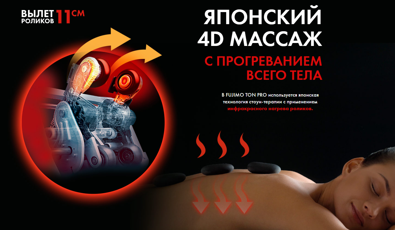 - Прогревание массажных роликов создает эффект японской стоунтерапии для всего тела