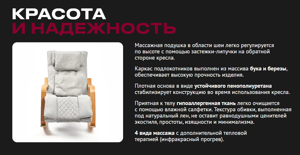 - уникальное сочетание кресло-качалки и полноценного массажного кресла