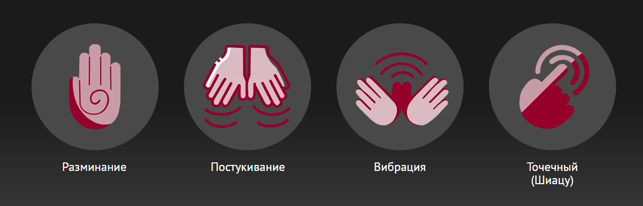 Вид массажа Вибрационный/Разминающий/ Точечный/Постукивающий