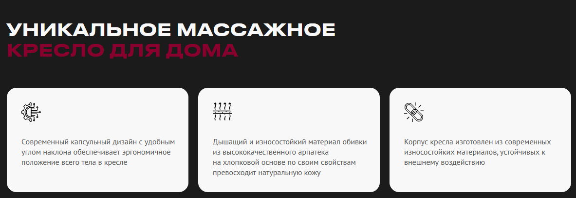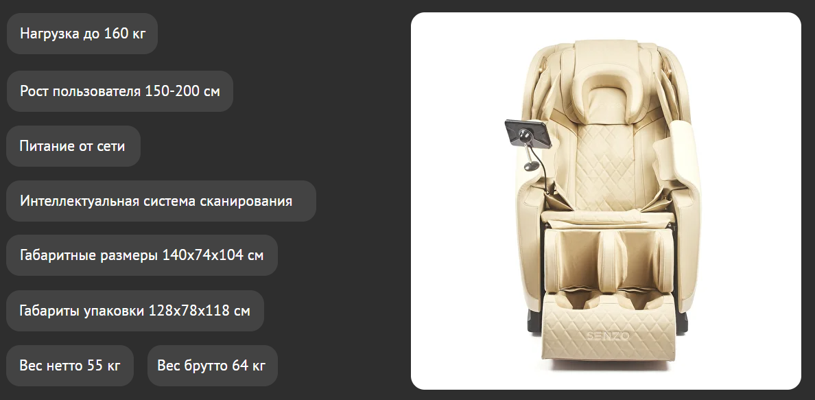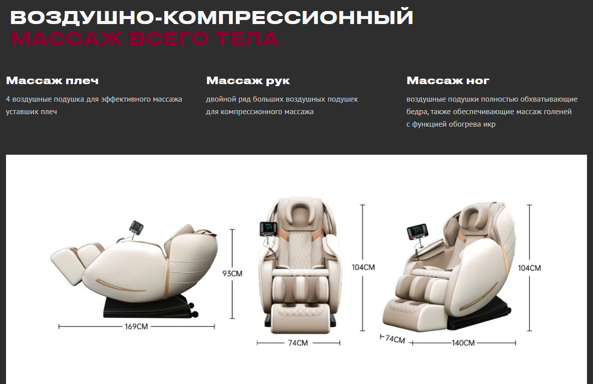 | Зоны массажа | Шея / Спина / Поясница / Плечи / Руки / Бедра / Ягодицы / Икры / Стопы |